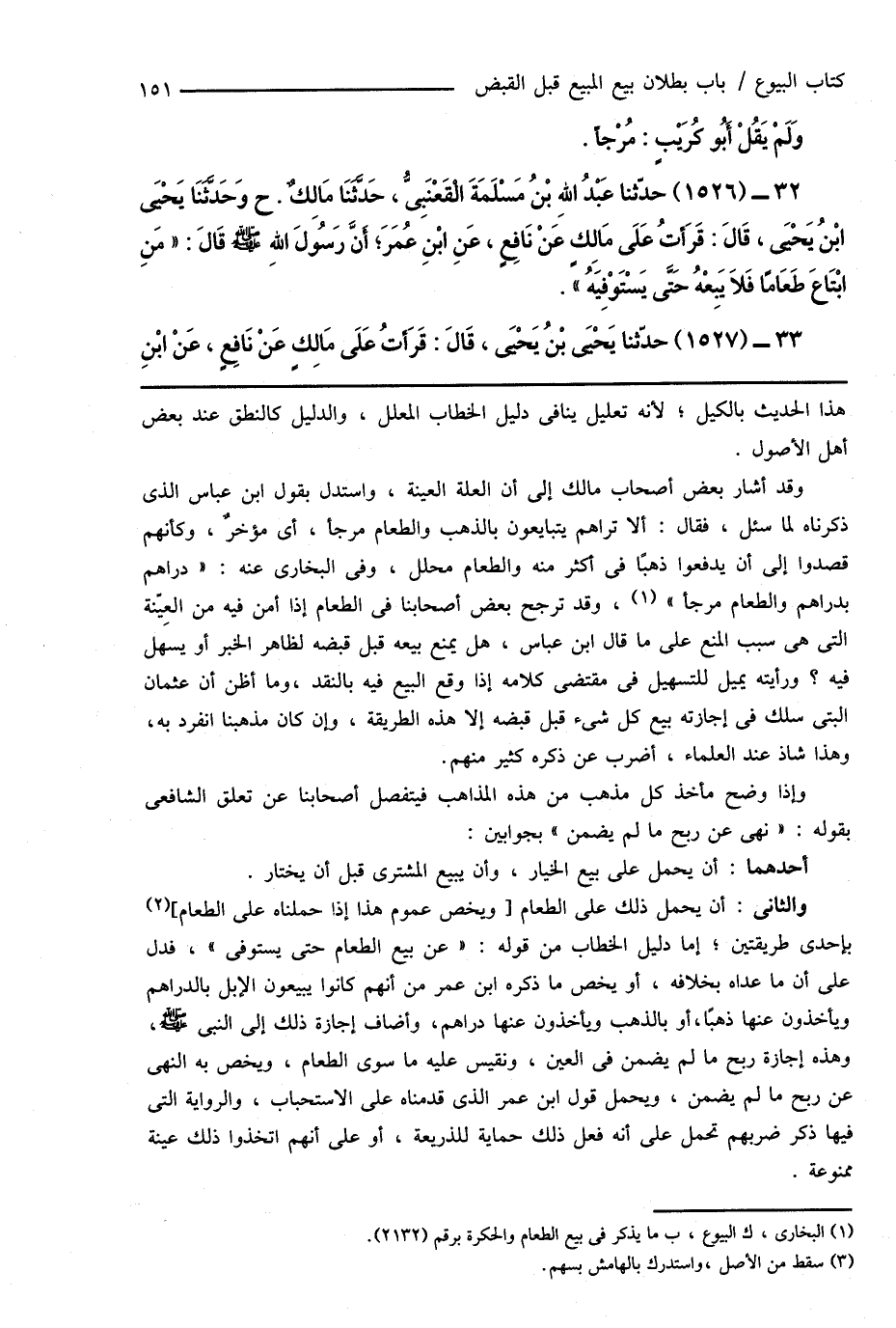 32 - (1526) حدّثنا عَبْدُ اللهِ بْنُ مَسْلَمَةَ الْقَعْنَبِىُّ، حَدَّثَنَا مَالِكٌ. ح وَحَدَّثَنَا يَحْيَى ابْنُ يَحْيَى، قَالَ: قَرَأْتُ عَلَى مَالِكٍ عَنْ نَافِعٍ، عَنِ ابْنِ عُمَرَ؛ أَنَّ رَسُولَ اللهِ صَلَّى اللهُ عَلَيْهِ وَسَلَّمَ قَالَ: " مَنِ ابْتَاعَ طَعَامًا فَلَا يَبِعْهُ حَتَّى يَسْتَوْفِيَهُ ".