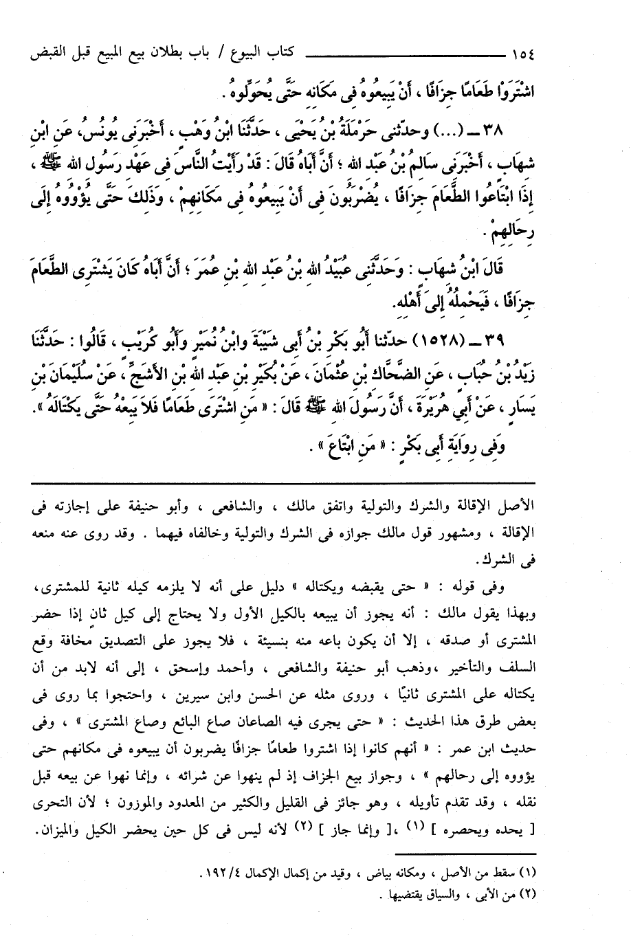 38 - (...) وحدّثنى حَرْمَلَةُ بْنُ يَحْيَى، حَدَّثَنَا ابْنُ وَهْبٍ، أَخْبَرَنِى يُونُسُ، عَنِ ابْنِ شِهَابٍ، أَخْبَرَنِى سَالِمُ بْنُ عَبْدِ اللهِ؛ أَنَّ أَبَاهُ قَالَ: قَدْ رَأَيْتُ النَّاسَ فِى عَهْدِ رَسُولِ اللهِ صَلَّى اللهُ عَلَيْهِ وَسَلَّمَ، إِذَا ابْتَاعُوا الطَّعَامَ جِزَافًا، يُضْرَبُونَ فِى أَنْ يَبِيعُوهُ فِى مَكَانِهِمْ، وَذَلِكَ حَتَّى يُؤْوُوهُ إِلَى رِحَالِهِمْ.