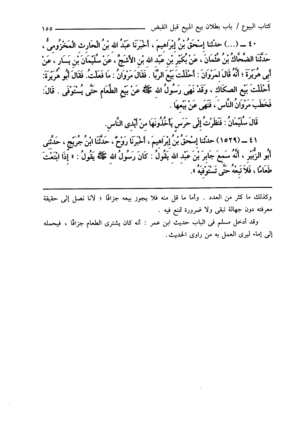41 - (1529) حدّثنا إِسْحَاقُ بْنُ إِبْرَاهِيمَ، أَخْبَرَنَا رَوْحٌ، حَدَّثَنَا ابْنُ جُرَيْجٍ، حَدَّثَنِى أَبُو الزُّبَيْرِ، أَنَّهُ سَمِعَ جَابِرَ بْنَ عَبْدِ اللهِ يَقُولُ: كَانَ رَسُولُ اللهِ صَلَّى اللهُ عَلَيْهِ وَسَلَّمَ يَقُولُ: " إِذَا ابْتَعْتَ طَعَامًا، فَلَا تَبِعْهُ حَتَّى تَسْتَوْفِيَهُ ".
