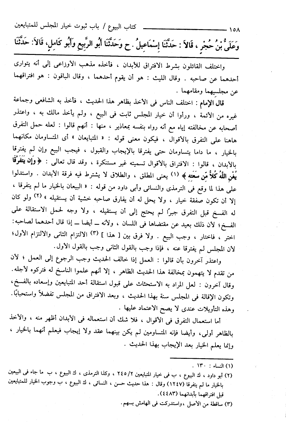 (¬2) أبو داود، ك البيوع، ب فى خيار المتبايعين 2/ 245، وكذا الترمذى، ك البيوع، ب ما جاء فى البيعين بالخيار ما لم يتفرقا (1247) وقال: هذا حديث حسن، النسائى، ك البيوع، ب وجوب الخيار للمتبايعين قبل افتراقهما بأبدانهما (4483).