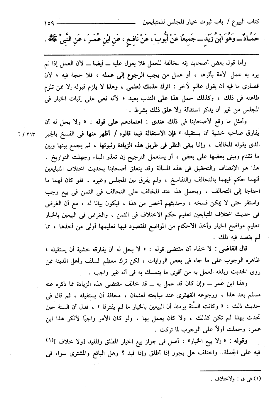 وهذا ابن عمر - وإن كان قد عمل به - قد خالف مقتضى هذه الزيادة مما ذكره عنه مسلم بعد هذا، ورجوعه القهقرى عند مبايعته لعثمان، مخافة أن يستقيله، ثم قال فى حديث ذلك: " وكانت السُنة يومئذ أن البيعين بالخيار ما لم يفترقا "، فدل أن السنة حين تحدث بهذا لم تكن كذلك، ولا كان يعمل بها، ولو كان الأمر واجبًا لأنكر هذا ابن عمر، وحملت أولاً على الوجوب لما تركت.