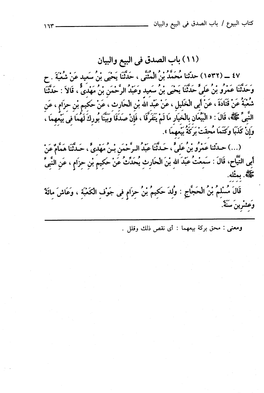 47 - (1532) حدّثنا مُحَمَّدُ بْنُ الْمُثَنَّى، حَدَّثَنَا يَحْيَى بْنُ سَعِيدٍ عَنْ شُعْبَةَ. ح وَحَدَّثَنَا عَمْرُو بْنُ عَلِىٍّ حَدَّثَنَا يَحْيَى بْنُ سَعِيدٍ وَعَبْدُ الرَّحْمَنِ بْنُ مَهْدِىٍّ، قَالَا: حَدَّثَنَا شُعْبَةُ عَنْ قَتَادَةَ، عَنْ أَبِى الْخَلِيلِ، عَنْ عَبْدِ اللهِ بْنِ الْحَارِثِ، عَنْ حَكِيمِ بْنِ حِزَامٍ، عَنِ النَّبِىِّ صَلَّى اللهُ عَلَيْهِ وَسَلَّمَ، قَالَ: " الْبَيِّعَانِ بِالْخِيَارِ مَا لَمْ يَتَفَرَّقَا، فَإِنْ صَدَقَا وَبَيَّنَا بُورِكَ لَهُمَا فِى بَيْعِهِمَا، وَإِنْ كَذَبَا وَكَتَمَا مُحِقَتْ بَرَكَةُ بَيْعِهِمَا ".