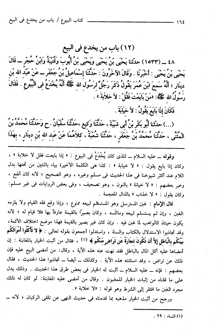 48 - (1533) حدّثنا يَحْيَى بْنُ يَحْيَى وَيَحْيَى بْنُ أَيُّوبَ وَقُتَيْبَةُ وَابْنُ حُجْرٍ - قَالَ يَحْيَى بْنُ يَحْيَى: أَخْبَرَنَا. وَقَالَ الآخَرُونَ: حَدَّثَنَا إِسْمَاعِيلُ بْنُ جَعْفَرٍ - عَنْ عَبْدِ اللهِ بْنِ دِينَارٍ؛ أَنَّهُ سَمِعَ ابْنَ عُمَرَ يَقُولُ ذَكَرَ رَجُلٌ لِرَسُولِ اللهِ صَلَّى اللهُ عَلَيْهِ وَسَلَّمَ أَنَّهُ يُخْدَعُ فِى الْبُيُوعِ. فَقَالَ رسُولُ اللهِ صَلَّى اللهُ عَلَيْهِ وَسَلَّمَ: " مَنْ بَايَعْتَ فَقُلْ: لَا خِلاَبةَ ".