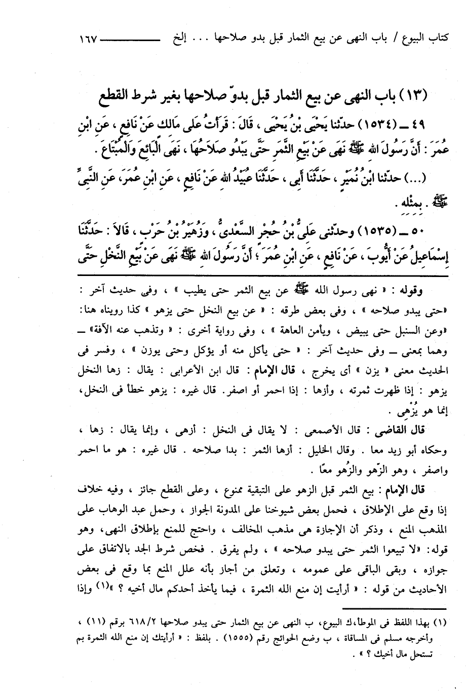 49 - (1534) حدّثنا يَحْيَى بْنُ يَحْيَى، قَالَ: قَرَأْتُ عَلى مَالِكٍ عَنْ نَافِعٍ، عَنِ ابْنِ عُمَرَ: أن رَسُولَ اللهِ صَلَّى اللهُ عَلَيْهِ وَسَلَّمَ نَهَى عَنْ بَيْعِ الثَّمَرِ حَتَّى يَبْدُو صَلاَحُهَا، نَهَى الْبَائِعَ وَالْمُبْتَاعَ.