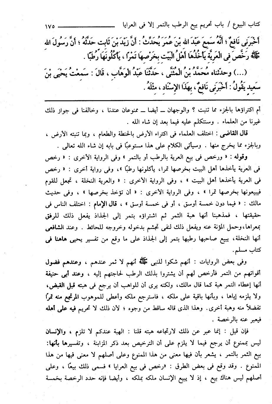 قال القاضى: اختلف العلماء فى اكتراء الأرض بالحنطة والطعام، وبما تنبته الأرض، وبالجزء مما يخرج منها. وسيأتى الكلام على هذا مستوعبًا فى بابه إن شاء الله تعالى. وقوله: " ورخص فى بيع العرية بالرطب أو بالتمر " وفى الرواية الأخرى: " رخص فى العرية يأخذها أهل البيت بخرصها تمرًا، يأكلونها رطبًا "، وفى رواية أخرى: " رخص فى العرية يأخذها أهل البيت "، وفى الرواية الأخرى: " والعرية النخلة، تجعل للقوم فيبيعونها بخرصها تمرًا "، وفى الرواية الأخرى: " أن تؤخذ بخرصها "، وفى حديث مالك: " فيما دون خمسة أوسق، أو فى خمسة أوسق "، قال الإمام: اختلف الناس فى حقيقتها، فمذهبنا أنها هبة الثمر ثم اشتراؤه بتمر إلى الجذاذ يفعل ذلك للرفق بمعراها، وحمل المؤنة عنه ويفعل ذلك لنفى تجشم بدخوله وخروجه للحائط. وعند الشافعى أنها النخلة، يبيع صاحبها رطبها بتمر إلى الجذاذ على ما وقع من تفسير يحيى هاهنا فى كتاب مسلم.