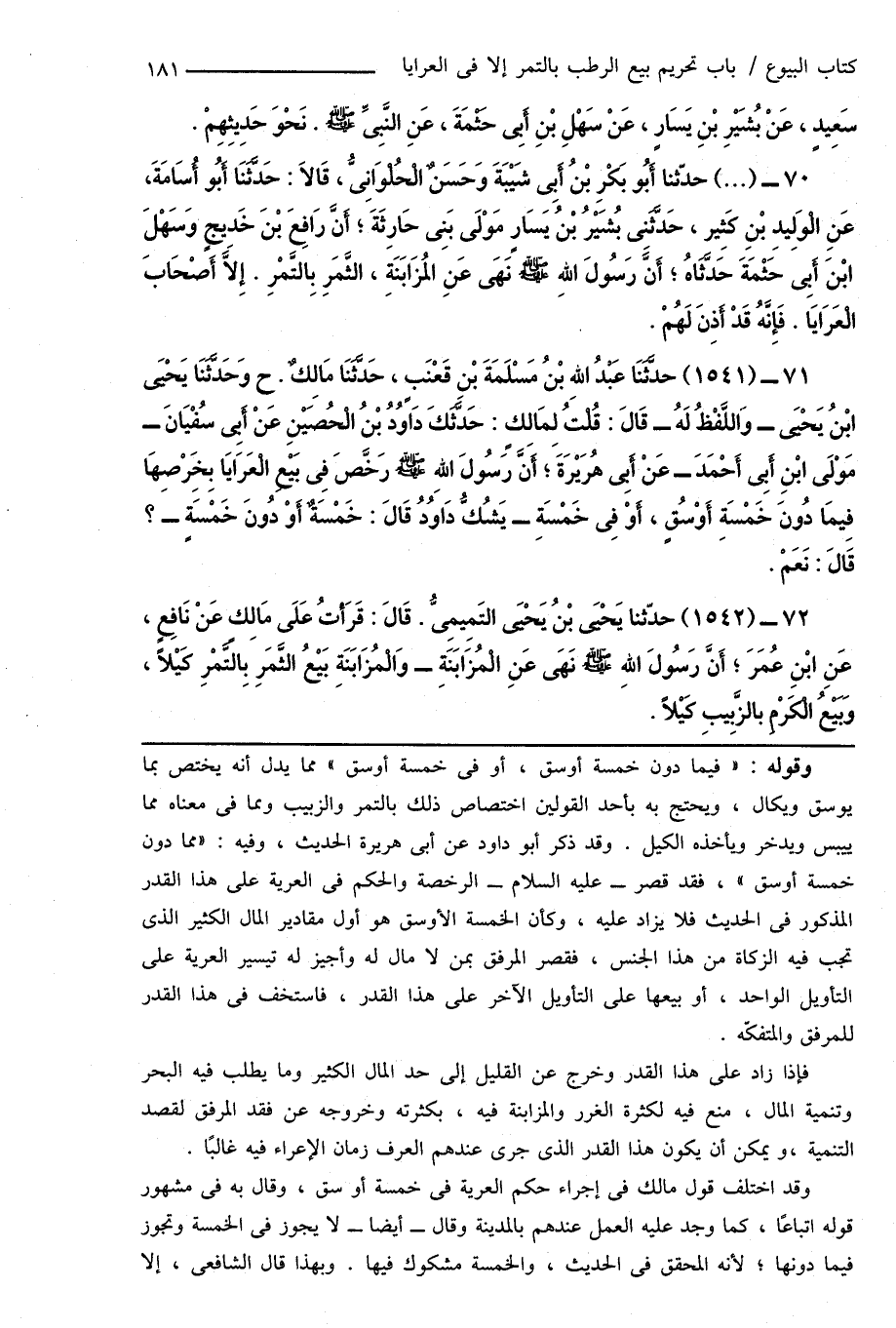 71 - (1541) حَدَّثَنَا عَبْدُ اللهِ بْنُ مَسْلَمَةَ بْنُ قَعْنَبٍ، حَدَّثَنَا مَالِكٌ. ح وَحَدَّثَنَا يَحْيَى ابْنُ يَحْيَى - وَاللَّفْظُ لَهُ - قَالَ: قُلْتُ لِمَالِكٍ: حَدَّثَكَ دَاوُدُ بْنُ الْحُصَيْنِ عَنْ أَبِى سُفْيَانَ - مَوْلَى ابْنِ أَبِى أَحْمَدَ - عَنْ أَبِى هُرَيْرَةَ؛ أَنَّ رَسُولَ اللهِ صَلَّى اللهُ عَلَيْهِ وَسَلَّمَ رَخَّصَ فِى بَيْعِ الْعَرَايَا بِخَرْصِهَا فِيمَا دُونَ خَمْسَةِ أَوْسُقٍ، أَوْ فِى خَمْسَةِ - يَشُكُّ دَاوُدُ قَالَ: خَمْسَةٌ أَوْ دُونَ خَمْسَةٍ -؟ قَالَ: نَعَمْ.