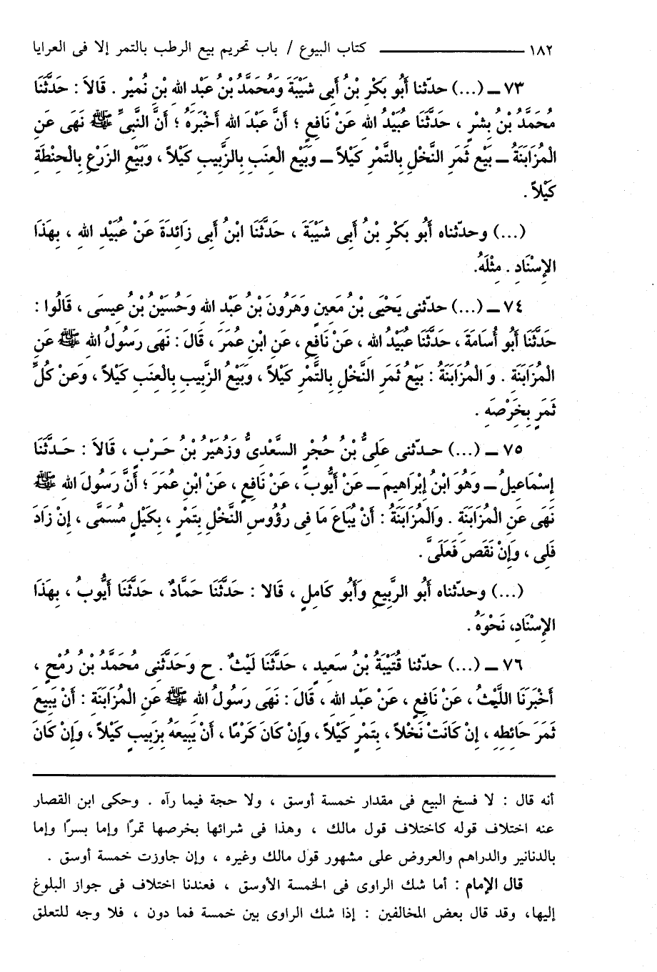 73 - (...) حدّثنا أَبُو بَكْرِ بْنُ أَبِى شَيْبَةَ وَمُحَمَّدُ بْنُ عَبْدِ اللهِ بْنِ نُمَيْرٍ. قَالَا: حَدَّثَنَا مُحَمَّدُ بْنُ بِشْرٍ، حَدَّثَنَا عُبَيْدُ اللهِ عَنْ نَافِعٍ؛ أَنَّ عَبْدَ اللهِ أَخْبَرَهُ؛ أَنَّ النَّبِىّ صَلَّى اللهُ عَلَيْهِ وَسَلَّمَ نَهَى عَنِ الْمُزَابَنَةُ - بَيْع ثَمَرِ النَّخْلِ بِالتَّمْرِ كَيْلاً - وَبَيْع الْعِنَبِ بِالزَّبِيبِ كَيْلاً، وَبَيْعِ الزَرْعِ بِالْحِنْطَةِ كَيْلاً.