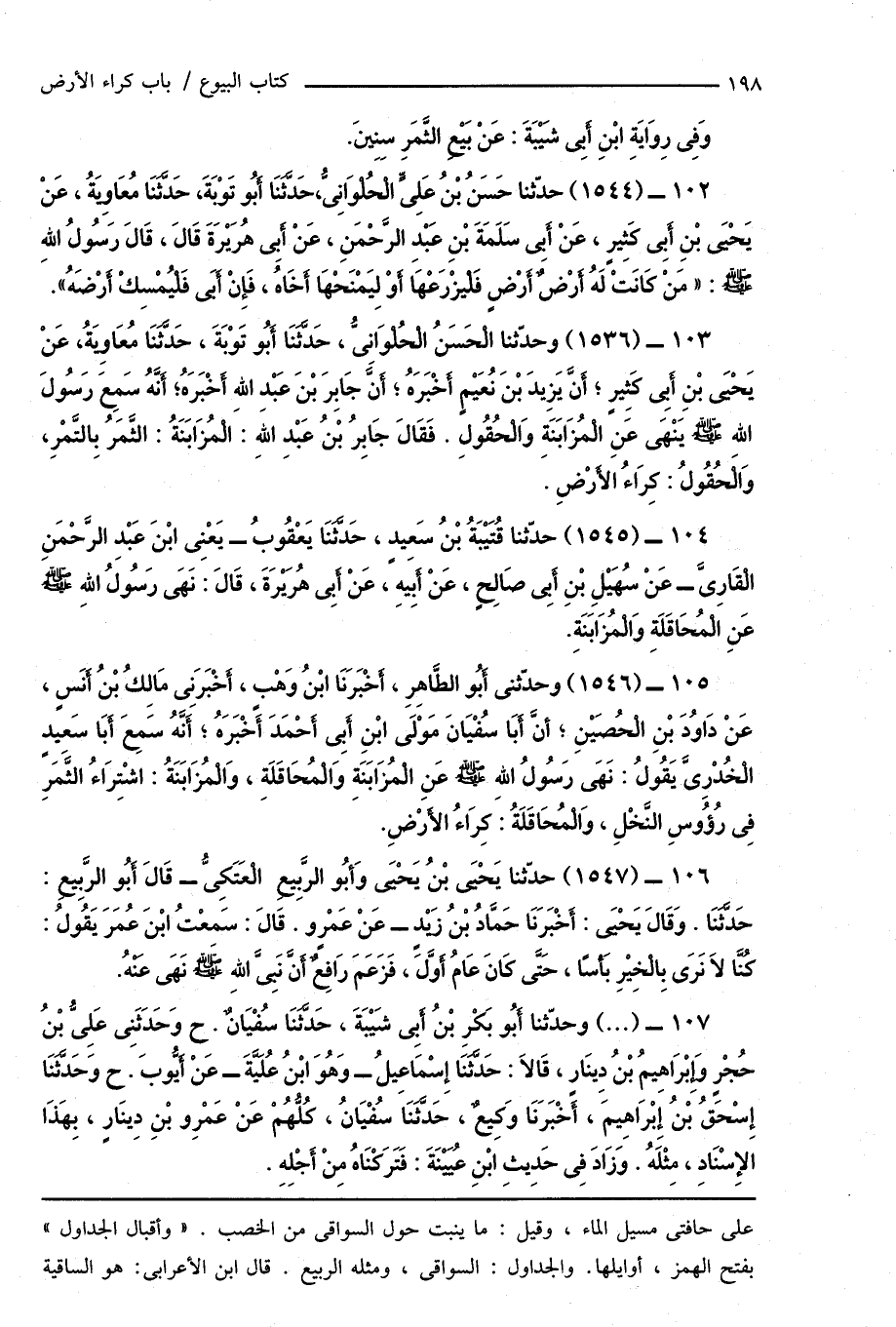 104 - (1545) حدّثنا قُتَيْبَةُ بْنُ سَعِيدٍ، حَدَّثَنَا يَعْقُوبُ - يَعْنِى ابْنَ عَبْدِ الرَّحْمَنِ الْقَارِىَّ - عَنْ سُهَيْلِ بْنِ أَبِى صَالِحٍ، عَنْ أَبِيهِ، عَنْ أَبِى هُرَيْرَةَ، قَالَ: نَهَى رَسُولُ اللهِ صَلَّى اللهُ عَلَيْهِ وَسَلَّمَ عَنِ الْمُحَاقَلَةِ وَالْمُزَابَنَةِ.