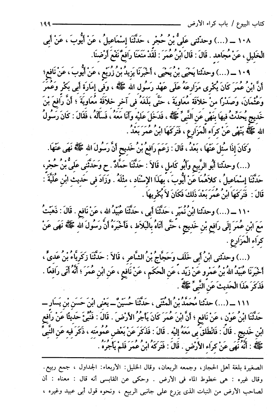 110 - (...) وحدّثنا ابْنُ نُمَيْرٍ، حَدَّثَنَا أَبِى، حَدَّثَنَا عُبَيْدُ اللهِ، عَنْ نَافِعٍ. قَالَ: ذَهَبْتُ مَعَ ابْنِ عُمَرَ إِلَى رَافِعِ بْنِ خَدِيجٍ، حَتَّى أَتَاهُ بِالْبَلَاطِ، فَأَخْبَرَهُ أَنَّ رَسُولَ اللهِ صَلَّى اللهُ عَلَيْهِ وَسَلَّمَ نَهَى عَنْ كِرَاءِ الْمَزَارِعِ.