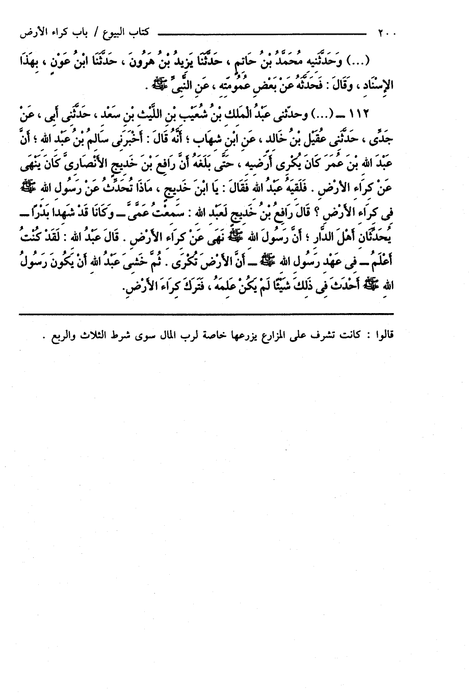 112 - (...) وحدّثنى عَبْدُ الْمَلِكِ بْنُ شُعَيْبِ بْنِ اللَّيْثِ بْنِ سَعْدِ، حَدَّثَنِى أَبِى، عَنْ جَدِّى، حَدَّثَنِى عُقَيْل بْنُ خَالِدٍ، عَنِ ابْنِ شِهَابٍ؛ أَنَّهُ قَالَ: أَخْبَرَنِى سَالِمُ بْنُ عَبْدِ اللهِ؛ أَنَّ عَبْدَ اللهِ بْنَ عُمَرَ كَانَ يُكْرِىَ أَرَضِيهِ، حَتَّى بَلَغَهُ أَنَّ رَافِعَ بْنَ خَدِيجٍ الأَنْصَارِىَّ كَانَ يَنْهَى عَنْ كِرَاءِ الأَرْضِ. فَلَقِيَهُ عَبْدُ اللهِ فَقَالَ: يَا ابْنَ خَدِيجٍ، مَاذَا تُحَدِّثُ عَنْ رَسُولِ اللهِ صَلَّى اللهُ عَلَيْهِ وَسَلَّمَ فِى كِرَاءِ الأَرْضِ؟ قَالَ رَافِعُ بْنُ خَدِيجٍ لِعَبْدِ اللهِ: سَمِعْتُ عَمَّىَّ - وَكَانَا قَدْ شَهِدَا بَدْرًا - يُحَدِّثَانِ أَهْلَ الدَّارِ؛ أَنَّ رَسُولَ اللهِ صَلَّى اللهُ عَلَيْهِ وَسَلَّمَ نَهَى عَنْ كِرَاءِ الأَرْضِ. قَالَ عَبْدُ اللهِ: لَقَدْ كُنْتُ أَعْلَمُ - فى عَهْدِ رَسُولِ اللهِ صَلَّى اللهُ عَلَيْهِ وَسَلَّمَ - أَنَّ الأَرْضَ تُكْرَى. ثُمَّ خَشِىَ عَبْدُ اللهِ أَنْ يَكُونَ رَسُولُ اللهِ صَلَّى اللهُ عَلَيْهِ وَسَلَّمَ أَحْدَثَ فِى ذَلِكَ شَيَئًا لَمْ يَكُنْ عَلِمَهُ، فَتَرَكَ كِرَاءَ الأَرْضِ.