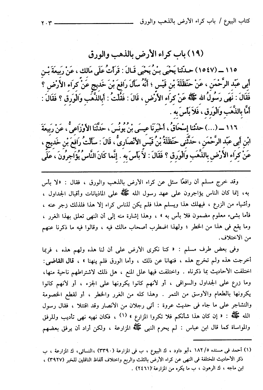 (¬1) أحمد فى مسنده 5/ 182، أبو داود، ك البيوع، ب فى المزارعة (3390)، النسائى، ك المزارعة، ب ذكر الأحاديث المختلفة فى النهى عن كراء الأرض بالثلث والربع واختلاف ألفاظ الناقلين للخبر (3927)، ابن ماجه، ك الرهون، ب ما يكره من المزارعة (2461).