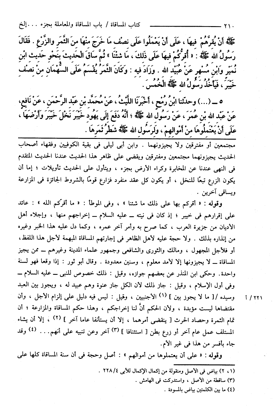 مجتمعين أو مفترقين ولا يجيزونهما. وابن أبى ليلى فى بقية الكوفيين وفقهاء أصحاب الحديث يجيزونهما مجتمعين ومفترقين ويقضى على ظاهر هذا الحديث عندنا الحديث المتقدم فى النهى عندنا عن المخابرة وكراء الأرض بجزء، ويتأول على الحديث تأويلات؛ إما أن يكون الزرع تبعًا للنخل، أو يكون كل عقد منفرد فزارع قومًا بالشروط الجائزة فى المزارعة ويساقى آخرين.