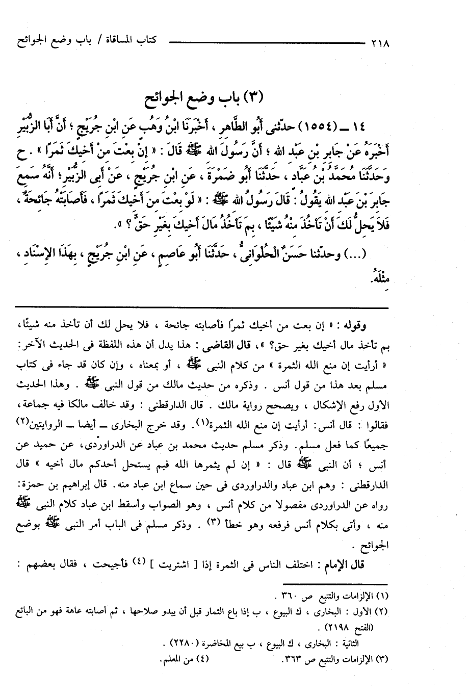 (¬2) الأول: البخارى، ك البيوع، ب إذا باع الثمار قبل أن يبدو صلاحها، ثم أصابته عاهة فهو من البائع (الفتح 2198).