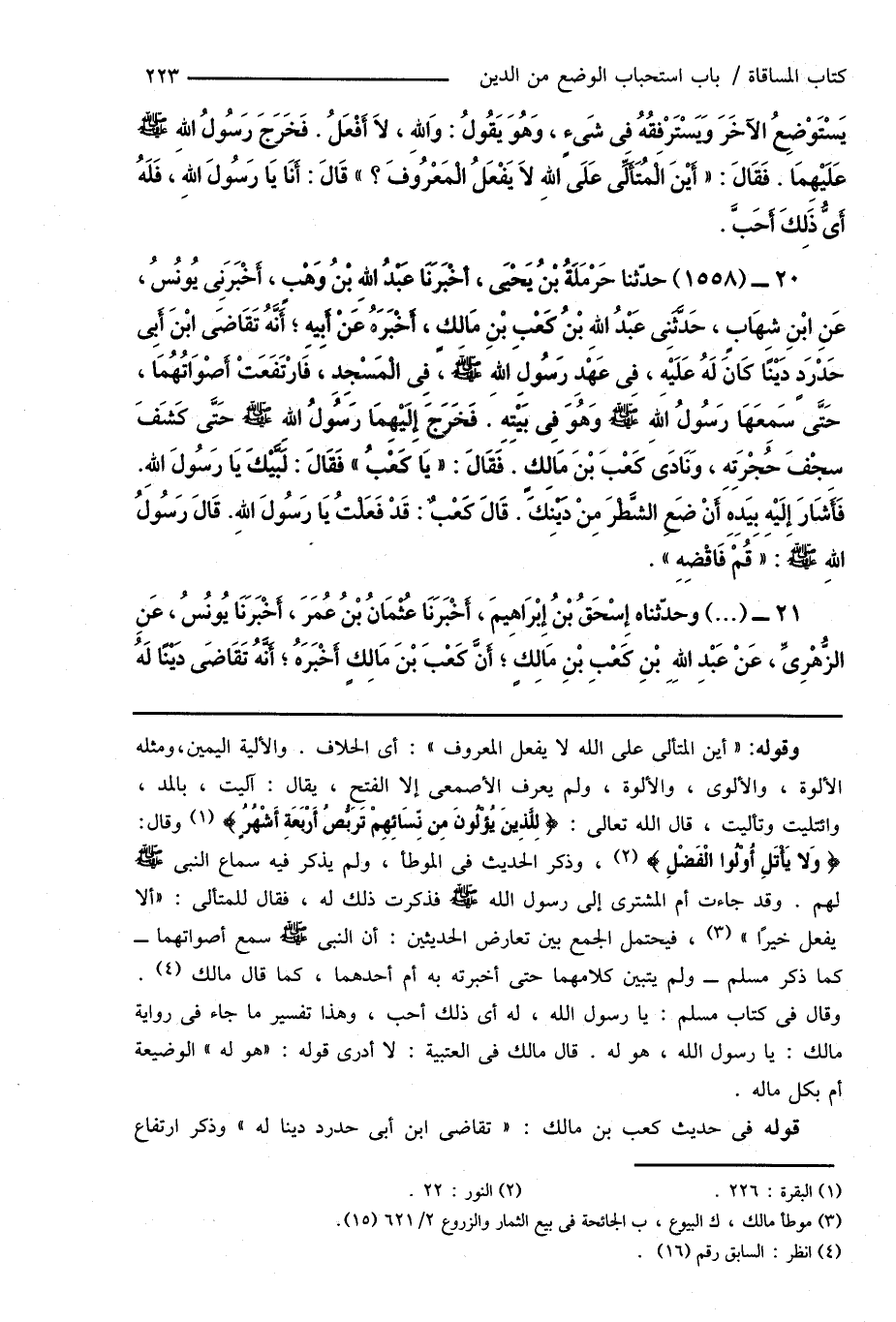 20 - (1558) حدّثنا حَرْمَلَةُ بْنُ يَحْيَى، أَخْبَرَنَا عَبْدُ اللهِ بْنُ وَهْبٍ، أَخْبَرَنِى يُونُسُ، عَنِ ابْنِ شِهَابٍ، حَدَّثَنِى عَبْدُ اللهِ بْنُ كَعْبِ بْنِ مَالِكٍ، أَخْبَرَهُ عَنْ أَبِيهِ؛ أَنَّهُ تَقَاضَى ابْنَ أَبِى حَدْرَدٍ دَيْنًا كَانَ لَهُ عَلَيْهِ، فى عَهْدِ رَسُولِ اللهِ صَلَّى اللهُ عَلَيْهِ وَسَلَّمَ، فِى الْمَسْجِدِ، فَارْتَفَعَتْ أَصْوَاتُهُمَا، حَتَّى سَمِعَهَا رَسُولُ اللهِ صَلَّى اللهُ عَلَيْهِ وَسَلَّمَ وَهُوَ فِى بَيْتِهِ. فَخَرَجَ إِلَيْهِمَا رَسُولُ الله صَلَّى اللهُ عَلَيْهِ وَسَلَّمَ حَتَّى كَشَفَ سِجْفَ حُجْرَتِهِ، وَنَادَى كَعْبَ بْنَ مَالِكٍ. فَقَالَ: " يَا كَعْبُ " فَقَالَ: لَبَّيْكَ يَا رَسُولَ اللهِ. فَأَشَارَ إِلَيْهِ بِيَدِهِ أَنْ ضَعِ الشَّطْرَ مِنْ دَيْنِكَ. قَالَ كَعْبٌ: قَدْ فَعَلْتُ يَا رَسُولَ اللهِ. قَالَ رَسُولُ اللهِ صَلَّى اللهُ عَلَيْهِ وَسَلَّمَ: " قُمْ فَاقْضِهِ ".
