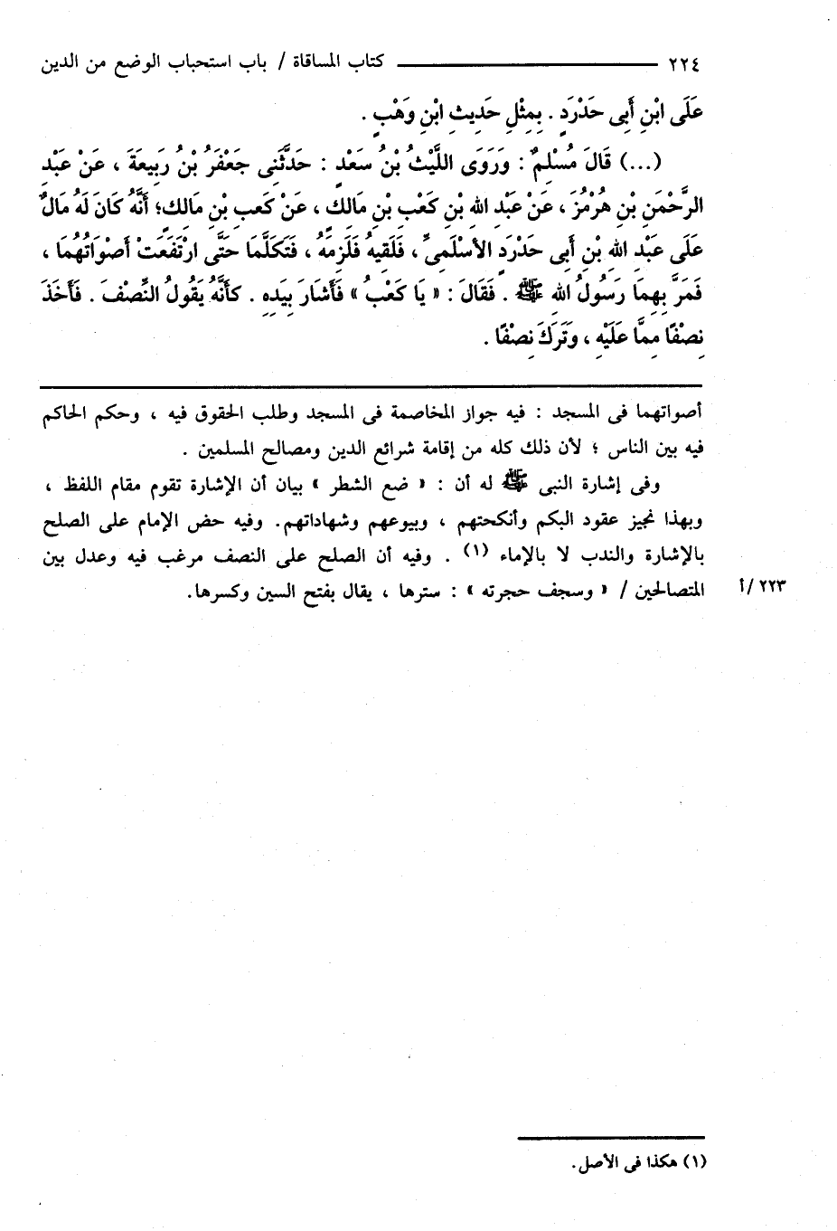 (...) قَالَ مُسْلِمٌ: وَرَوَى اللَّيْثُ بْنُ سَعْدٍ: حَدَّثَنِى جَعْفَرُ بْنُ رَبِيعَةَ، عَنْ عَبْدِ الرَّحْمَنِ بْنِ هُرْمُزَ، عَنْ عَبْدِ اللهِ بْنِ كَعْبِ بْنِ مَالِكٍ، عَنْ كَعبِ بْنِ مَالِكٍ؛ أَنَّهُ كَانَ لَهُ مَالٌ عَلَى عَبْدِ اللهِ بْنِ أَبِى حَدْرَدٍ الأَسْلَمِىِّ، فَلَقِيهُ فَلَزِمَهُ، فَتَكَلَّمَا حَتَّى ارْتَفَعَتْ أَصْوَاتُهُمَا، فَمَرَّ بِهِمَا رَسُولُ اللهِ صَلَّى اللهُ عَلَيْهِ وَسَلَّمَ. فَقَالَ: " يَا كَعْبُ " فَأَشَارَ بِيَدِهِ. كَأَنَّهُ - يَقُولُ النِّصْفَ. فَأَخَذَ نِصْفًا مِمَّا عَلَيْهِ، وَتَرَكَ نِصْفًا.