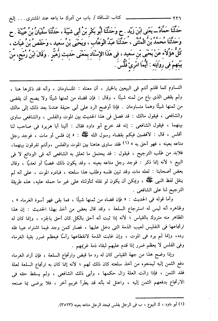 التساوم كما قلتم أنتم فى البيعين بالخيار، أن معناه: المتساومان، وأنه قد ذكرها هنا، ولم يقض الذى باع من ثمنه شيئًا، وقال: فإن قضاه من ثمنها شيئًا ولا يصح أن يقضى من ثمنها شيئًا وهما متساومان. فإذا أوضح الرد على أبى حنيفة عندنا بعد ذلك إلى مالك والشافعى، فيقول مالك: قد فصل فى هذا الحديث بين الموت والفلس، والشافعى ساوى بينهما، فيقول الشافعى: إنه قد خرج أبو داود فقال: أتينا أبا هريرة فى صاحب لنا أفلس، قال: لأقضين فيكم بقضاء رسول الله صَلَّى اللهُ عَلَيْهِ وَسَلَّمَ: " إن فلس أو مات، فوجد رجل متاعه بعينه، فهو أحق به " (¬1) فقد ساوى هاهنا بين الموت والفلس، وأنتم تفرقون بينهما، فلابد من طلب الترجيح، فيقول: قد يحتمل ما تعلق به الشافعى أنه فى الودائع لا فى البيع؛ لأنه إنما ذكر: فوجد رجل متاعه بعينه، وقد يكون ذلك غصبًا أو تعديًا، وقال بعض أصحابنا: لعله مات وقد تبين فلسه وطلب هذا سلعته، فبادره الموت، على أنه لم ينقل لفظ النبى صَلَّى اللهُ عَلَيْهِ وَسَلَّمَ، ويمكن أن يكون لو نقله لتأولناه على غير ما حمله عليه، هذه طريقة الترجيح لنا على الشافعى.