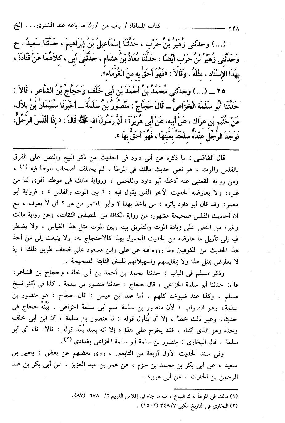25 - (...) وحدّثنى مُحَمَّدُ بْنُ أَحْمَدَ بْنِ أَبِى خَلَفٍ وَحَجَّاجُ بْنُ الشَّاعِرِ، قَالَا: حَدَّثَنَا أَبُو سَلَمَة الْخُزَاعِىُّ - قَالَ حَجَّاجٌ: مَنْصُورُ بْنُ سَلَمَةَ - أَخْبَرَنَا سُلَيْمَانُ بْنُ بِلَالٍ، عَنْ خُثَيْمِ بْنِ عِرَاكٍ، عَنْ أَبِيهِ، عَنْ أَبِى هُرَيْرَةَ؛ أَنَّ رَسُولَ اللهِ صَلَّى اللهُ عَلَيْهِ وَسَلَّمَ قَالَ: " إِذَا أَفْلَسَ الرَّجُلُ، فَوَجَدَ الرَّجُلُ عِنْدَهُ سِلْعَتَهُ بِعَيْنِهَا، فَهُوَ أَحَقُّ بِهَا ".