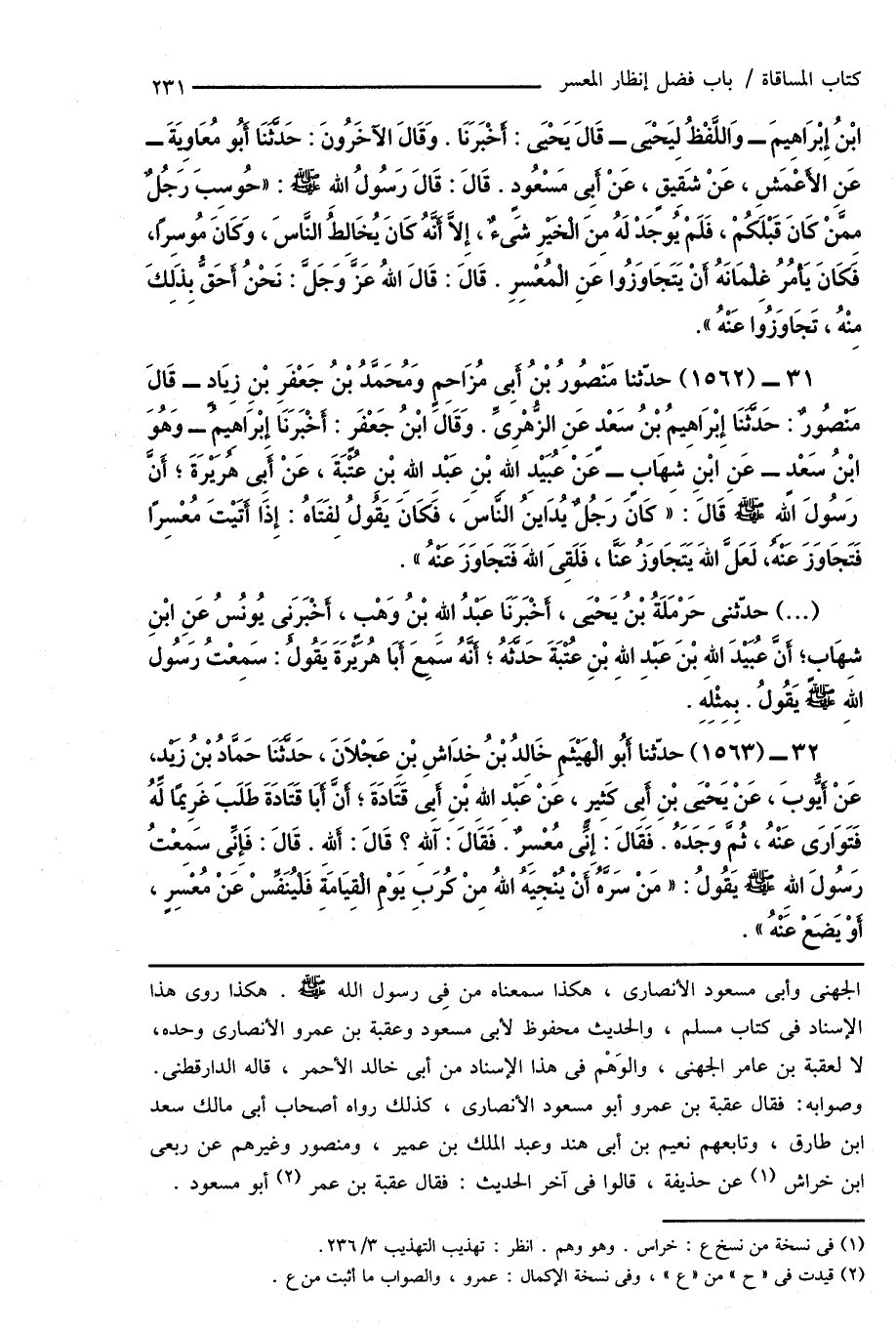 31 - (1562) حدّثنا مَنْصُورُ بْنُ أَبِى مُزَاحِمٍ وَمُحَمَّدُ بْنُ جَعْفَرِ بْنِ زِيَادٍ - قَالَ مَنْصُورٌ: حَدَّثَنَا إِبْرَاهِيمُ بْنُ سَعْدٍ عَنِ الزُّهْرِىِّ. وَقَالَ ابْنُ جَعْفَرٍ: أَخْبَرَنَا إِبْرَاهِيمُ - وَهُوَ ابْنُ سَعْدٍ - عَنِ ابْنِ شِهَابٍ - عَنْ عُبَيْدِ اللهِ بْنِ عَبْدِ اللهِ بْنِ عُتْبَةَ، عَنْ أَبِى هُرَيْرَةَ؛ أَنَّ رَسُولَ الله صَلَّى اللهُ عَلَيْهِ وَسَلَّمَ قَالَ: " كَانَ رَجُلٌ يُدَاينُ النَّاسَ، فَكَانَ يَقُولُ لِفَتَاهُ: إِذَا أَتَيْتَ مُعْسِرًا فَتَجَاوَزَ عَنْهُ، لَعَلَّ اللهَ يَتَجَاوَزُ عَنَّا، فَلَقِىَ اللهَ فَتَجَاوَزَ عَنْهُ ".