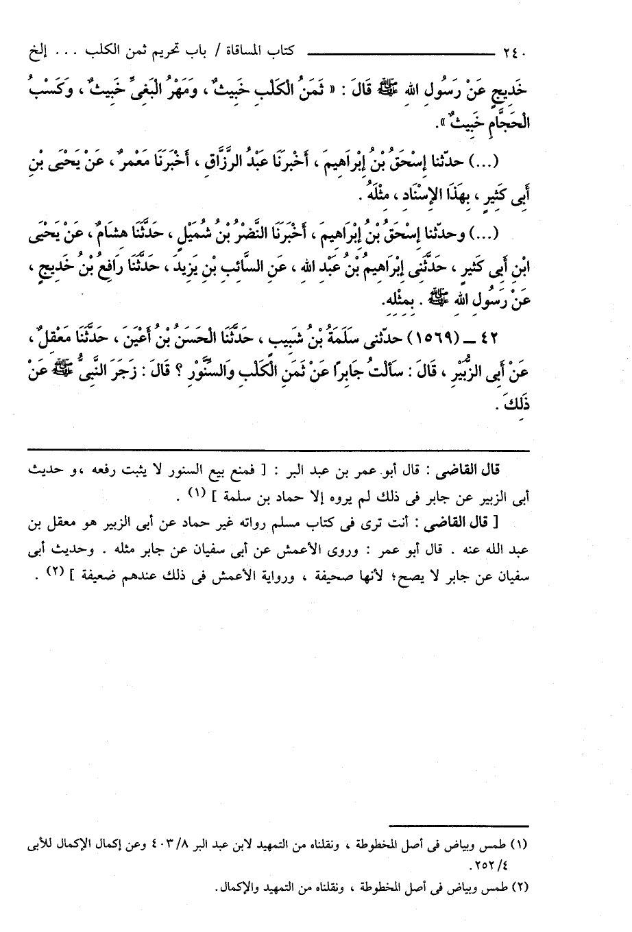 [قال القاضى: أنت ترى فى كتاب مسلم رواته غير حماد عن أبى الزبير هو معقل بن عبد الله عنه. قال أبو عمر: وروى الأعمش عن أبى سفيان عن جابر مثله. وحديث أبى سفيان عن جابر لا يصح؛ لأنها صحيفة، ورواية الأعمش فى ذلك عندهم ضعيفة] (¬2).