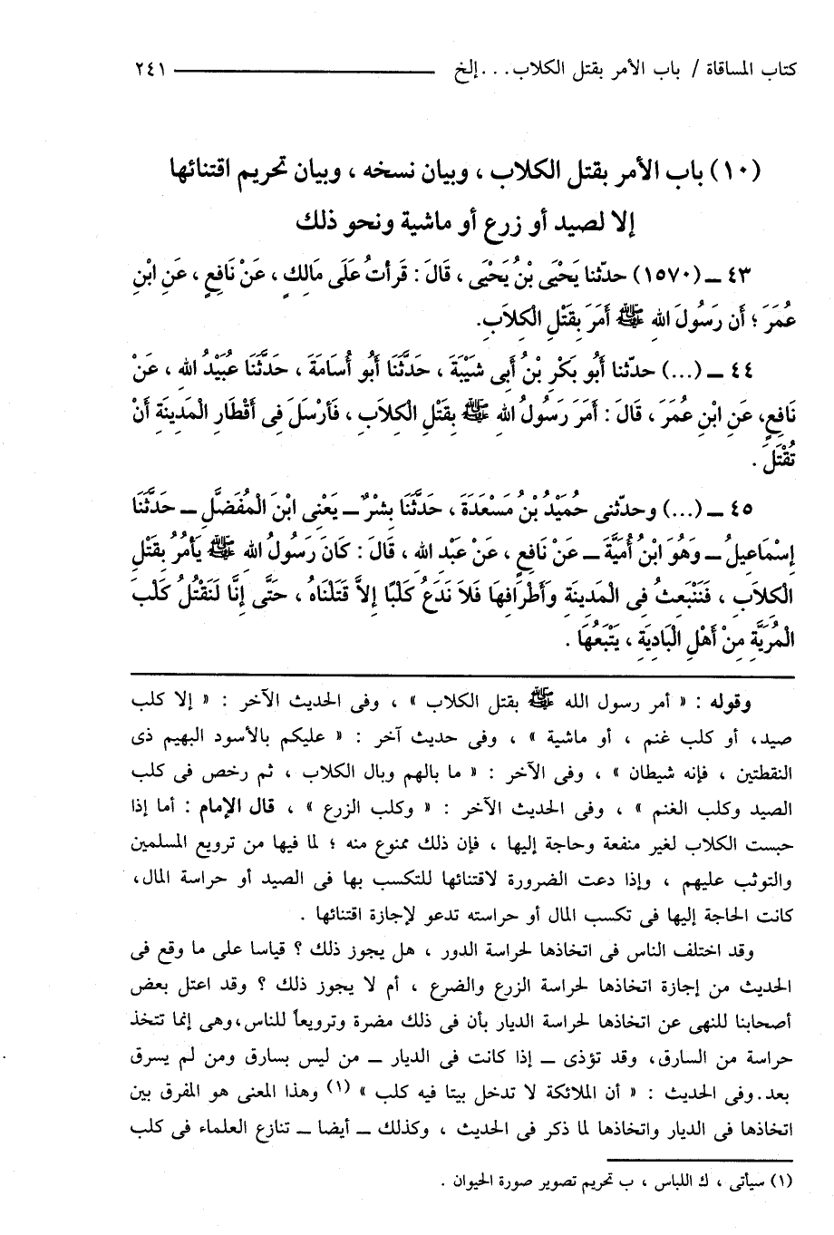 (10) باب الأمر بقتل الكلاب، وبيان نسخة، وبيان تحريم اقتنائها إلا لصيد أو زرع أو ماشية ونحو ذلك