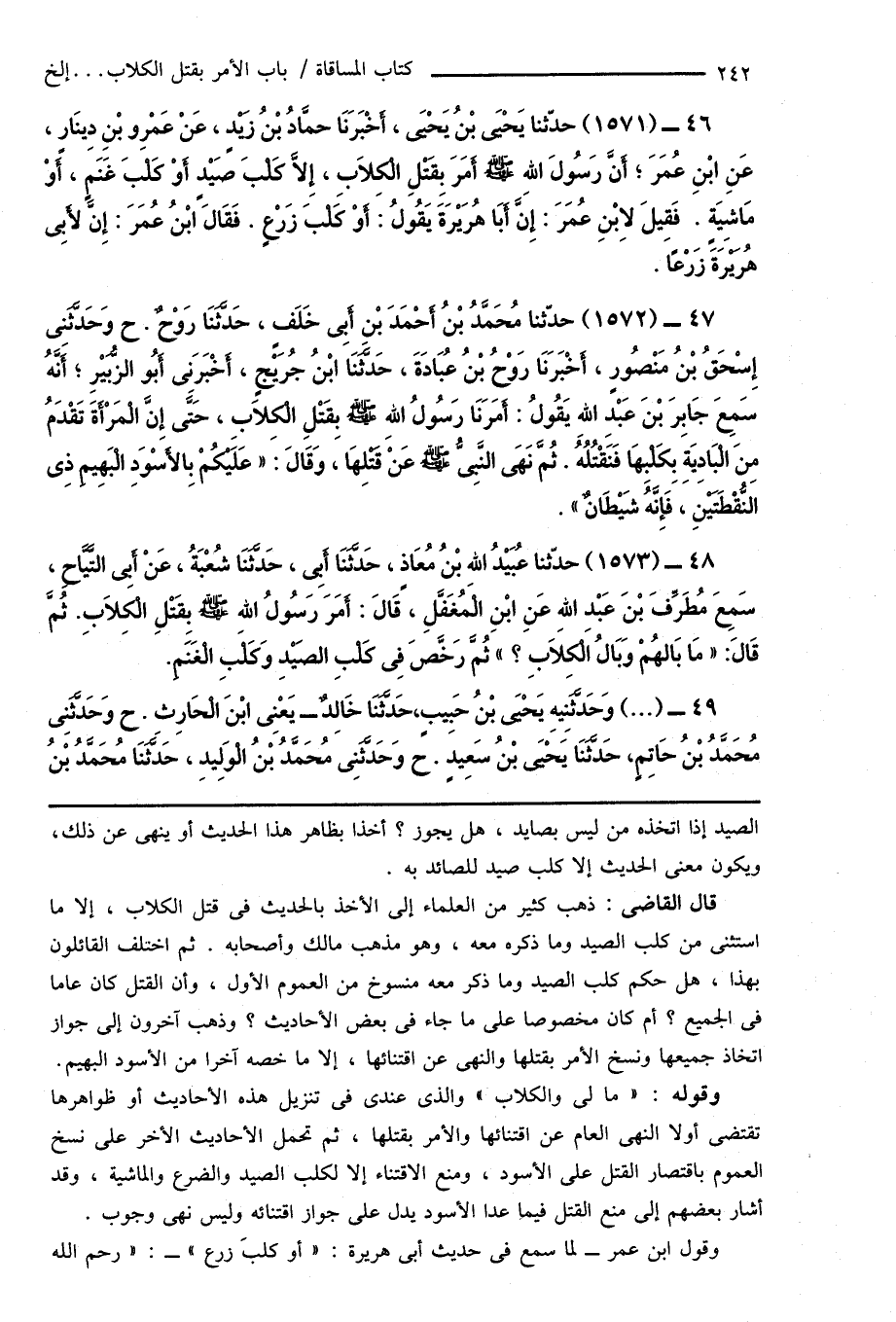 قال القاضى: ذهب كثير من العلماء إلى الأخذ بالحديث فى قتل الكلاب، إلا ما استثنى من كلب الصيد وما ذكره معه، وهو مذهب مالك وأصحابه. ثم اختلف القائلون بهذا، هل حكم كلب الصيد وما ذكر معه منسوخ من العموم الأول، وأن القتل كان عاماً فى الجميع؟ أم كان مخصوصاً على ما جاء فى بعض الأحاديث؟ وذهب آخرون إلى جواز اتخاذ جميعها ونسخ الأمر بقتلها والنهى عن اقتنائها، إلا ما خصه آخراً من الأسود البهيم.