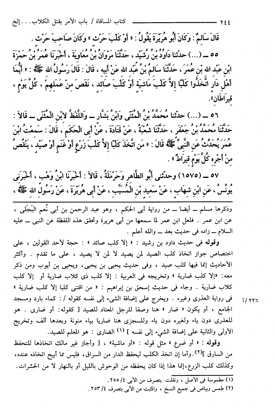 55 - (...) حدّثنا دَاوُدُ بْنُ رُشَيْدٍ، حَدَّثَنَا مَرْوَانُ بْنُ مُعَاوِيَةَ، أَخْبَرَنَا عُمَرُ بْنُ حَمْزَةَ ابْنِ عَبْدِ اللهِ بْنِ عُمَرَ، حَدَّثَنَا سَالِمُ بْنُ عَبْدِ اللهِ عَنْ أَبِيهِ، قَالَ: قَالَ رَسُولُ اللهِ صَلَّى اللهُ عَلَيْهِ وَسَلَّمَ: " أَيُّمَا أَهْلِ دَارٍ اتَّخَذُوا كَلْبًا إِلَّا كَلْبَ مَاشِيَةٍ أَوْ كَلْبَ صَائِدٍ، نَقَصَ مِنْ عَمَلِهِمْ، كُلَّ يَوْمٍ، قِيرَاطَانِ ".