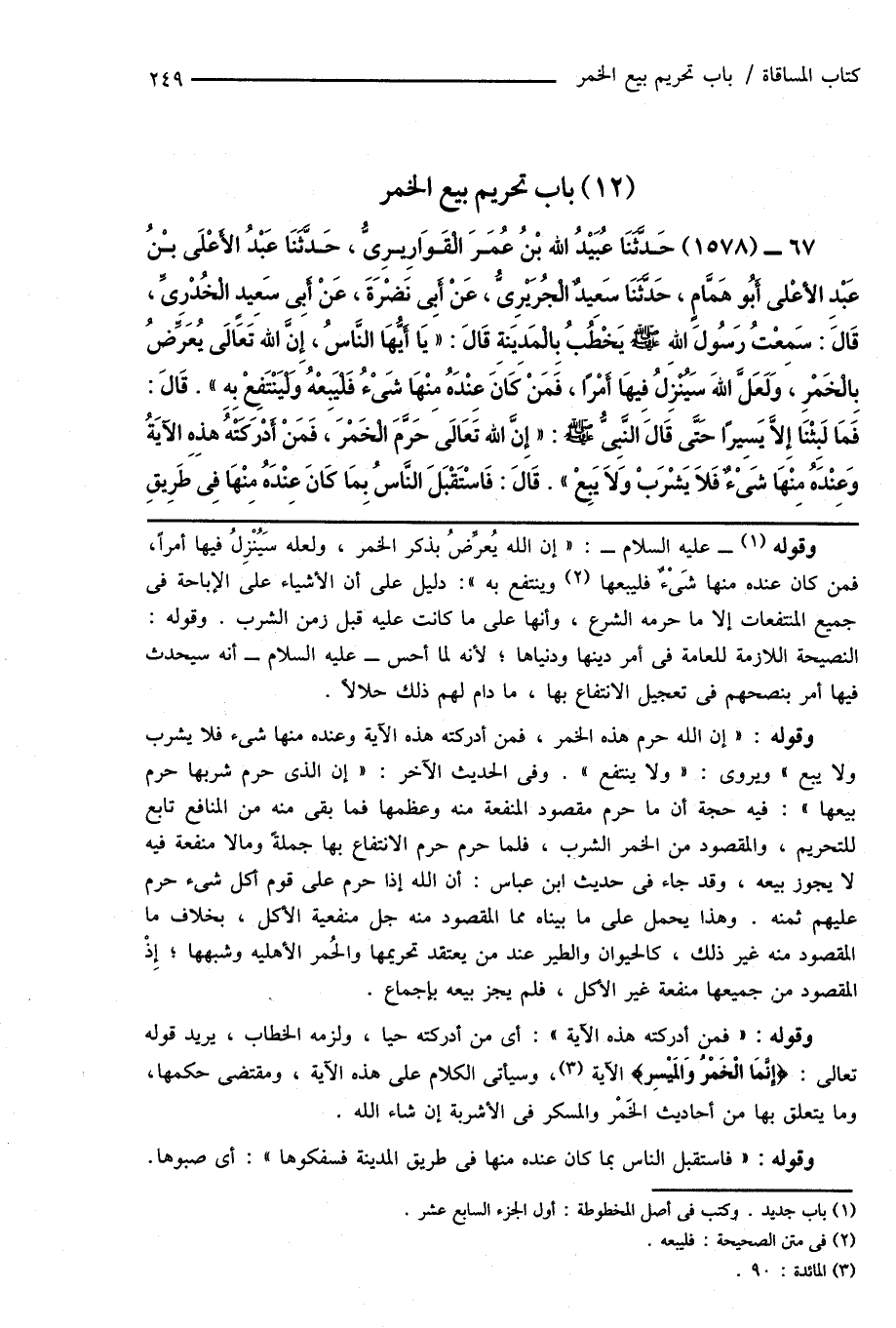 67 - (1578) حَدَّثَنَا عُبَيْدُ اللهِ بْنُ عُمَرَ الْقَوَارِيرِىُّ، حَدَّثَنَا عَبْدُ الأَعْلَى بْنُ عَبْدِ الأَعْلَى أَبُو هَمَّامٍ، حَدَّثَنَا سَعِيدٌ الْجُرَيْرِىُّ، عَنْ أَبِى نَضْرَةَ، عَنْ أَبِى سَعِيدٍ الْخُدْرِىِّ، قَالَ: سَمعْتُ رَسُولَ اللهِ صَلَّى اللهُ عَلَيْهِ وَسَلَّمَ يَخْطُبُ بِالْمَدِينَةِ قَالَ: " يَا أَيُّهَا النَّاسُ، إِنَّ اللهَ تَعَالَى يُعَرِّضُ بِالْخَمْرِ، وَلَعَلَّ اللهَ سَيُنْزِلُ فِيهَا أَمْرًا، فَمَنْ كَانَ عِنْدَهُ مِنْهَا شَىْءُ فَلْيَبِعْهُ وَلْيَنْتَفِعْ بِهِ ". قَالَ: فَمَا لَبِثْنَا إِلَّا يَسِيرًا حَتَّى قَالَ النَّبِىُّ صَلَّى اللهُ عَلَيْهِ وَسَلَّمَ: " إِنَّ الله تَعَالَى حَرَّمَ الْخَمْرَ، فَمَنْ أَدْرَكَتْهُ هذِهِ الآيَةُ وَعِنْدَهُ مِنْهَا شَىْءٌ فَلَا يَشْرَبْ وَلَا يَبِعْ ". قَالَ: فَاسْتَقْبَلَ النَّاسُ بِمَا كَانَ عِنْدَهُ مِنْهَا فِى طَرِيقِ