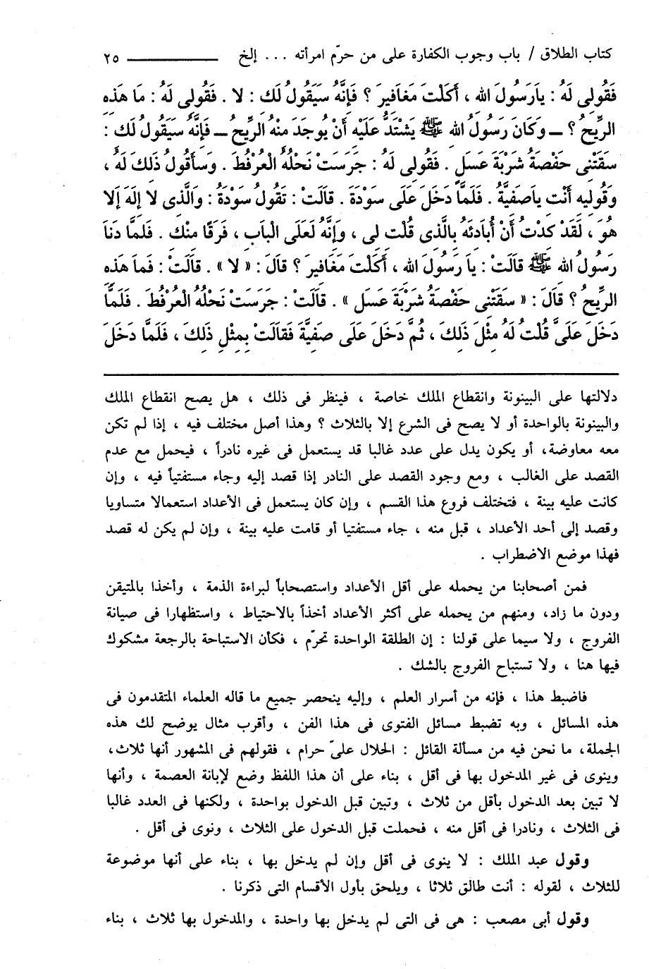 فاضبط هذا، فإنه من أصرار العلم، وإليه ينحصر جميع ما قاله العلماء المتقدمون فى هذه المسائل، وبه تضبط مسائل الفتوى فى هذا الفن، وأقرب مثال يوضح لك هذه الجملة، ما نحن فيه من مسألة القائل: الحلال علىّ حرام، فقولهم فى المشهور أنها ثلاث، وينوى فى غير المدخول بها فى أقل، بناء على أن هذا اللفظ وضع لإبانة العصمة، وأنها لا تبين بعد الدخول بأقل من ثلاث، وتبين قبل الدخول بواحدة، ولكنها فى العدد غالباً فى الثلاث، ونادراً فى أقل منه، فحملت قبل الدخول على الثلاث، ونوى فى أقل.