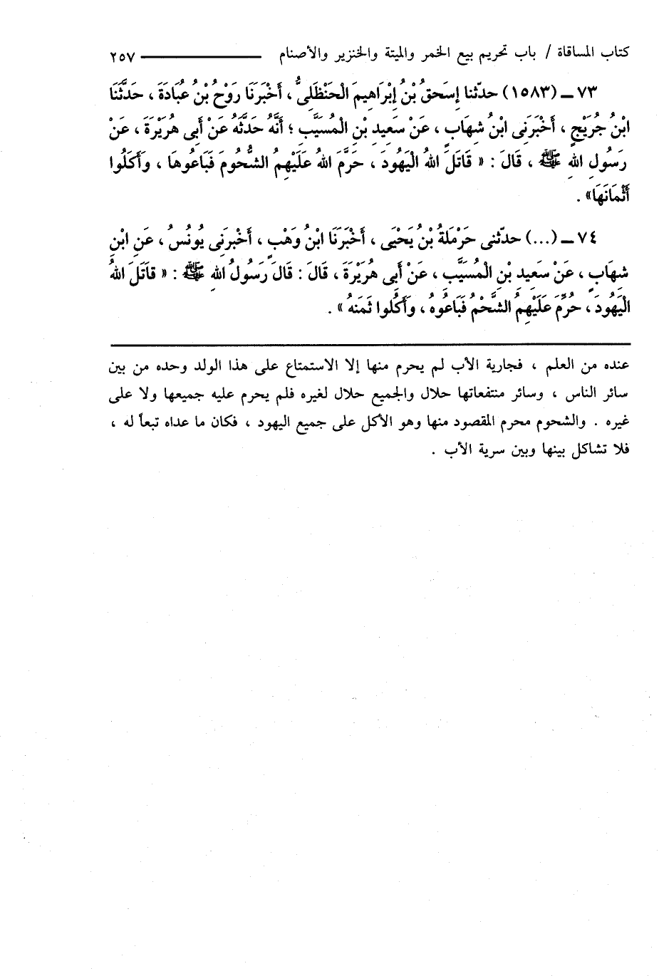 73 - (1583) حدّثنا إِسَحقُ بْنُ إِبْرَاهِيمَ الْحَنْظَلِىُّ، أَخْبَرَنَا رَوْحُ بْنُ عُبَادَةَ، حَدَّثَنَا ابْنُ جُرَيْجٍ، أَخْبَرَنِى ابْنُ شِهَابٍ، عَنْ سَعِيدِ بْنِ الْمُسَيّبِ؛ أَنَّهُ حَدَّثَهُ عَنْ أَبِى هُرَيْرَةَ، عَنْ رَسُولِ اللهِ صَلَّى اللهُ عَلَيْهِ وَسَلَّمَ، قَالَ: " قَاتَلَ اللهُ الْيَهُودَ، حَرَّمَ اللهُ عَلَيْهِمُ الشُّحُومَ فبَاعُوهَا، وَأَكَلُوا أَثْمَانَهَا ".