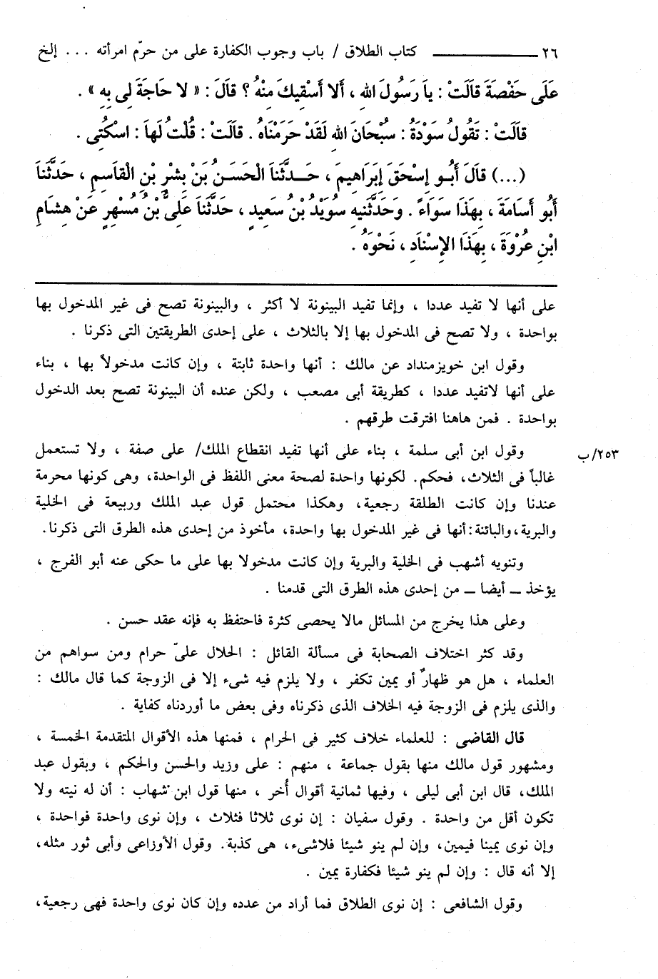 قال القاضى: للعلماء خلاف كثير فى الحرام، فمنها هذه الأقوال المتقدمة الخمسة، ومشهور قول مالك منها بقول جماعة، منهم: على وزيد والحسن والحكم، وبقول عبد الملك، قال ابن أبى ليلى، وفيها ثمانية أقوال أُخر، منها قول ابن شهاب: أن له نيته ولا تكون أقل من واحدة. وقول سفيان: إن نوى ثلاثاً فثلاث، وإن نوى واحدة فواحدة، وإن نوى يميناً فيمين، وان لم ينو شيئاً فلا شىء، هى كذبة. وقول الأوزاعى وأبى ثور مثله، إلا أنه قال: وإن لم ينو شيئاً فكفارة يمين.