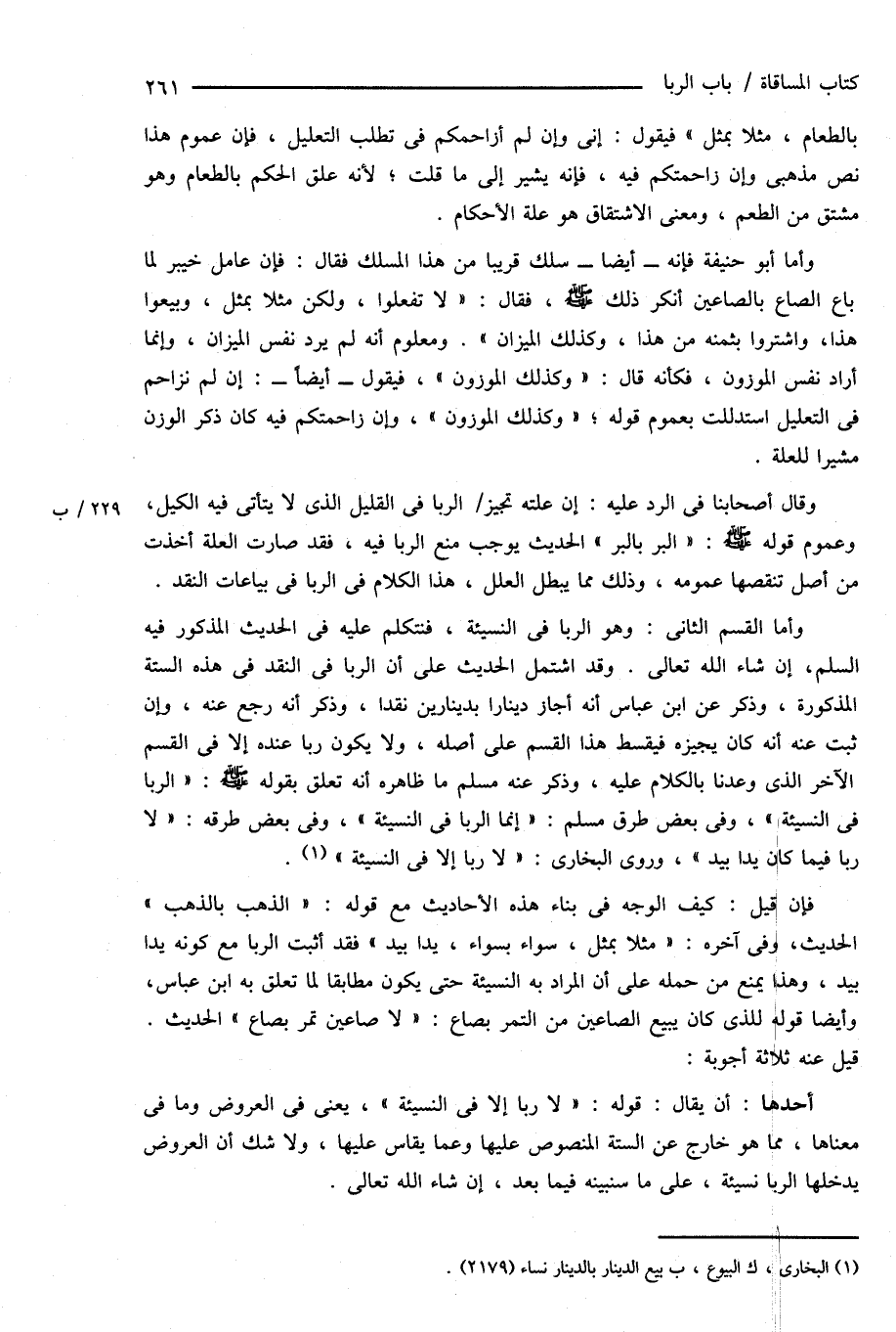 أحدها: أن يقال: قوله: " لا ربا إلا فى النسيئة "، يعنى فى العروض وما فى معناها، مما هو خارج عن الستة المنصوص عليها وعما يقاس عليها، ولا شك أن العروض يدخلها الربا نسيئة، على ما سنبينه فيما بعد، إن شاء الله تعالى.
