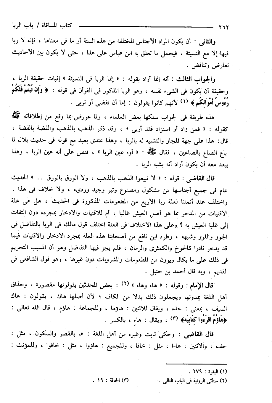 والجواب الثالث: أنه إنما أراد بقوله: " إنما الربا فى النسيئة " إثبات حقيقة الربا، وحقيقة أن يكون فى الشىء نفسه، وهو الربا المذكور فى القرآن فى قوله: {وَإِن تُبْتُمْ فَلَكُمْ رُءُوسُ أَمْوَالِكُم} (¬1) لأنهم كانوا يقولون: إما أن تقضى أو تربى.