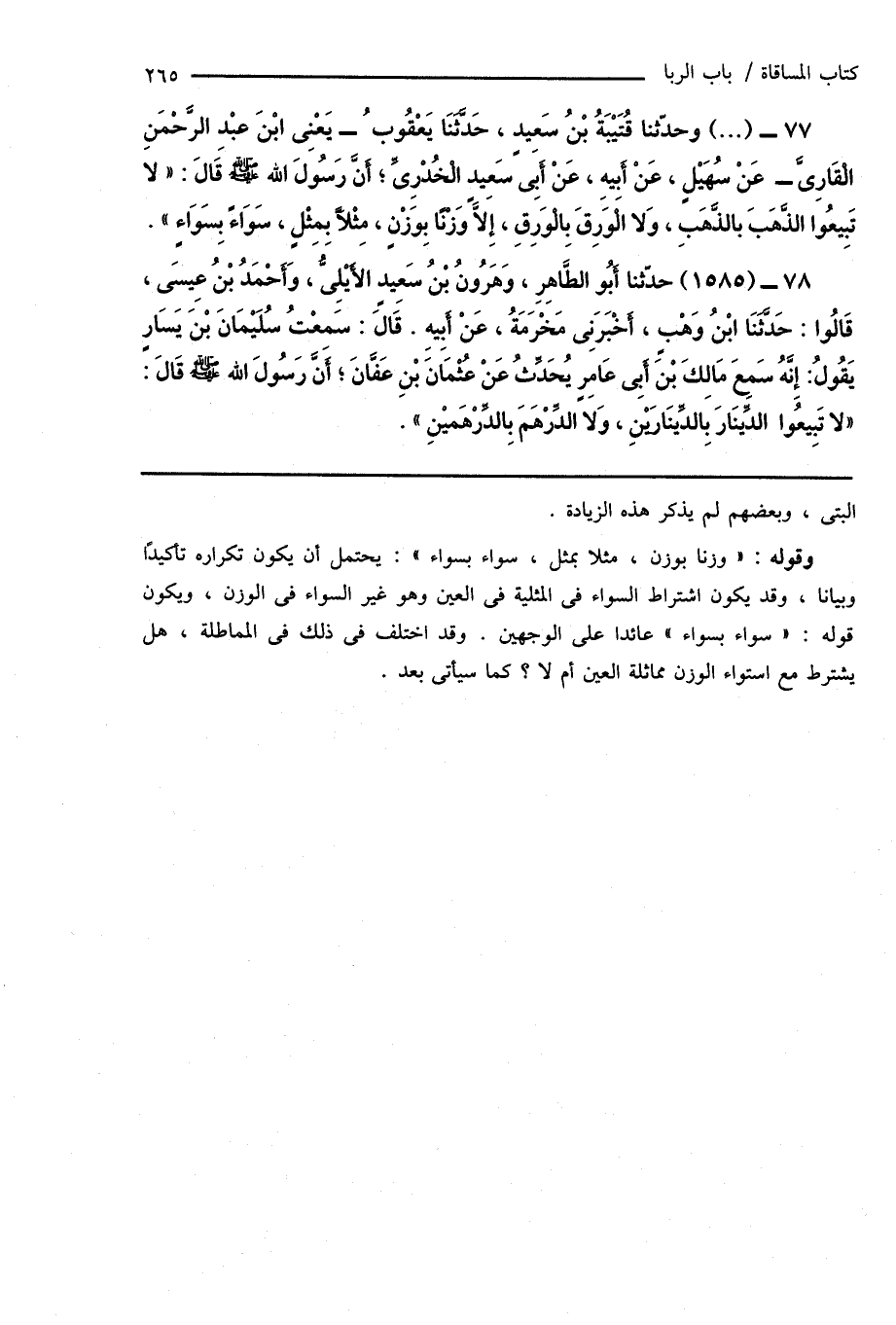 77 - (...) وحدّثنا قُتَيْبَةُ بْنُ سَعِيدٍ، حَدَّثَنَا يَعْقُوبُ - يَعْنِى ابْنَ عَبْدِ الرَّحْمَنِ الْقَارِىَّ - عَنْ سُهَيْلٍ، عَنْ أَبِيهِ، عَنْ أَبِى سَعِيدٍ الْخُدْرِىِّ؛ أَنَّ رَسُولَ اللهِ صَلَّى اللهُ عَلَيْهِ وَسَلَّمَ قَالَ: " لا تَبِيعُوا الذَّهَبَ بِالذَّهَبِ، وَلا الْوَرِقَ بِالْوَرِقِ، إِلَّا وَزنًا بِوَزْنٍ، مِثْلاً بِمِثْلٍ، سَوَاءً بِسَوَاءٍ ".