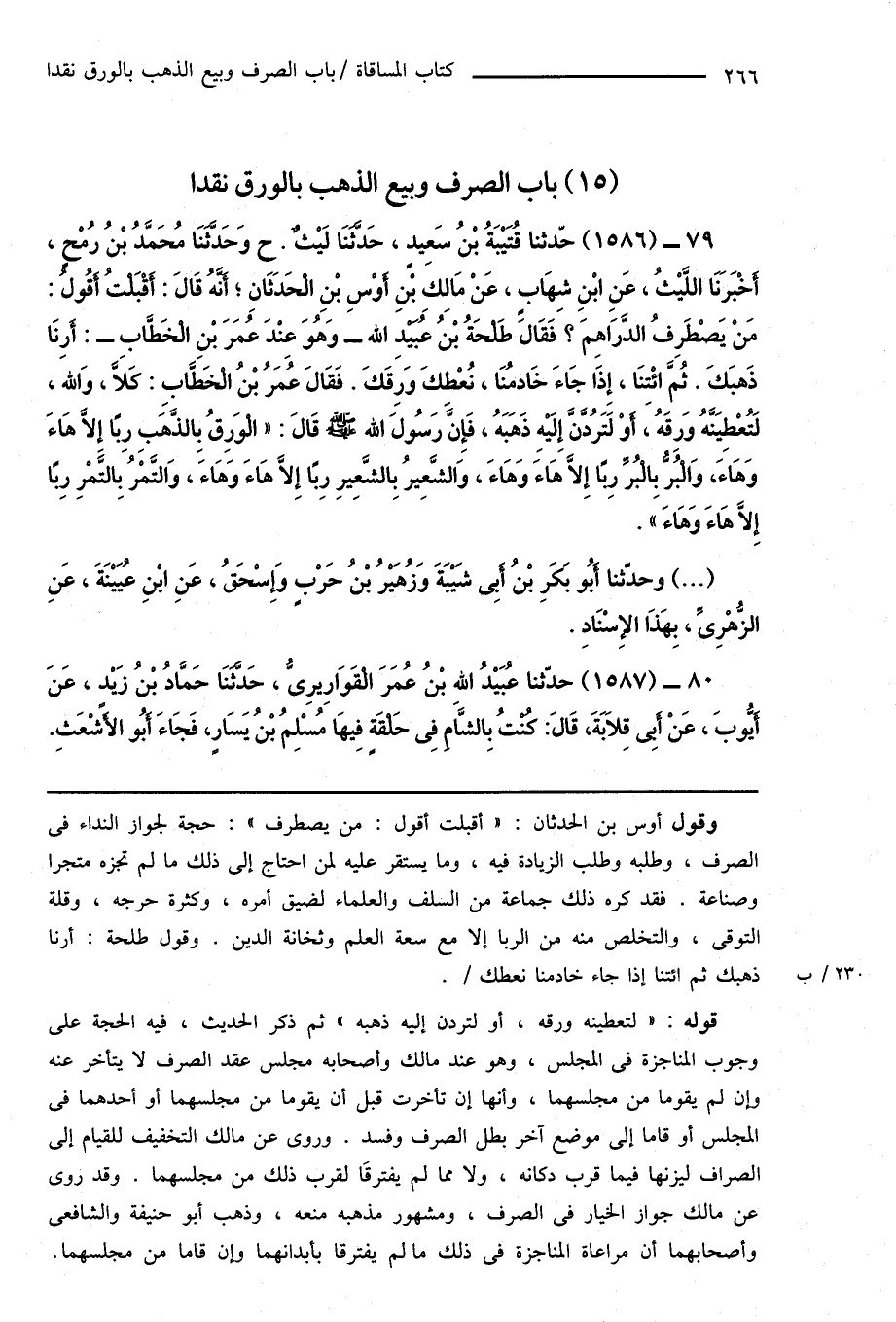 79 - (1586) حدّثنا قُتَيْبَةُ بْنُ سَعِيدٍ، حَدَّثَنَا لَيْثٌ. ح وَحَدَّثَنَا مُحَمَّدُ بْنُ رُمْحٍ، أَخْبَرَنَا اللَّيْثُ، عَنِ ابْنِ شِهَابٍ، عَنْ مَالِكِ بْنِ أَوْسِ بْنِ الْحَدَثَانِ؛ أَنَّهُ قَالَ: أَقْبَلْتُ أَقُولُ: مَنْ يَصْطَرِفُ الدَّرَاهِمَ؟ فَقَالَ طَلْحَةُ بْنُ عُبَيْدِ اللهِ - وَهُوَ عِنْدَ عُمَرَ بْنِ الْخَطَّابِ -: أَرِنَا ذَهبَكَ. ثُمَّ ائْتِنَا، إِذَا جَاءَ خَادمُنَا، نُعْطِكَ وَرِقَكَ. فَقَالَ عُمَرُ بْنُ الْخَطَّابِ: كَلَّا، وَاللهِ، لَتُعْطِيَنَّهُ وَرِقَهُ، أَوْ لَتَرُدَّنَّ إِلَيْهِ ذَهَبَهُ، فَإِنَّ رَسُولَ اللهِ صَلَّى اللهُ عَلَيْهِ وَسَلَّمَ قَالَ: " الوَرِقُ بِالذَّهَبِ رِبًا إِلَّا هَاءَ وَهَاءَ، وَالْبُرُّ بِالْبُرِّ رِبًا إِلَّا هَاءَ وَهَاءَ، وَالشَّعِيرُ بِالشَّعِيرِ رِبًا إِلا هَاءَ وَهَاءَ، وَالتَّمْرُ بِالتَّمْرِ رِبًا إِلَّا هَاءَ وَهَاءَ ".