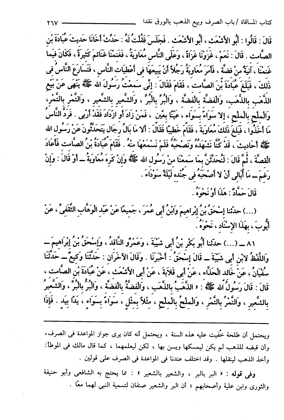81 - (...) حدّثنا أَبُو بَكْرِ بْنُ أَبِى شَيْبَةَ، وَعَمْرٌو النَّاقِدُ، وَإِسْحَاقُ بْنُ إِبْرَاهِيمَ - وَاللَّفْظُ لابْنِ أَبِى شَيْبَةَ - قَالَ إِسْحَاقُ: أَخْبَرَنَا. وَقَالَ الآخَرَانِ: حَدَّثَنَا وَكِيعٌ - حَدَّثَنَا سُفْيَانُ، عَنْ خَالِدٍ الْحَذَّاءِ، عَنْ أَبِى قلَابةَ، عَنْ أَبِى الأَشْعَثِ، عَنْ عُبَادَةَ بْن الصَّامِتِ، قَالَ: قَالَ رَسُولُ اللهِ صَلَّى اللهُ عَلَيْهِ وَسَلَّمَ: " الذَّهَبُ بِالذَّهَبِ، وَالْفِضَّةُ بِالْفِضَّةِ، وَالْبُرُّ بِالْبُرِّ، وَالشَّعِيرُ بِالشَّعِيرِ، وَالتَّمْرُ بِالتَّمْرِ، وَالْمِلْحُ بِالْمِلْحِ، مِثْلاً بِمِثْلٍ، سَوَاءً بِسَوَاءٍ، يَدًا بِيَدٍ. فَإِذَا
