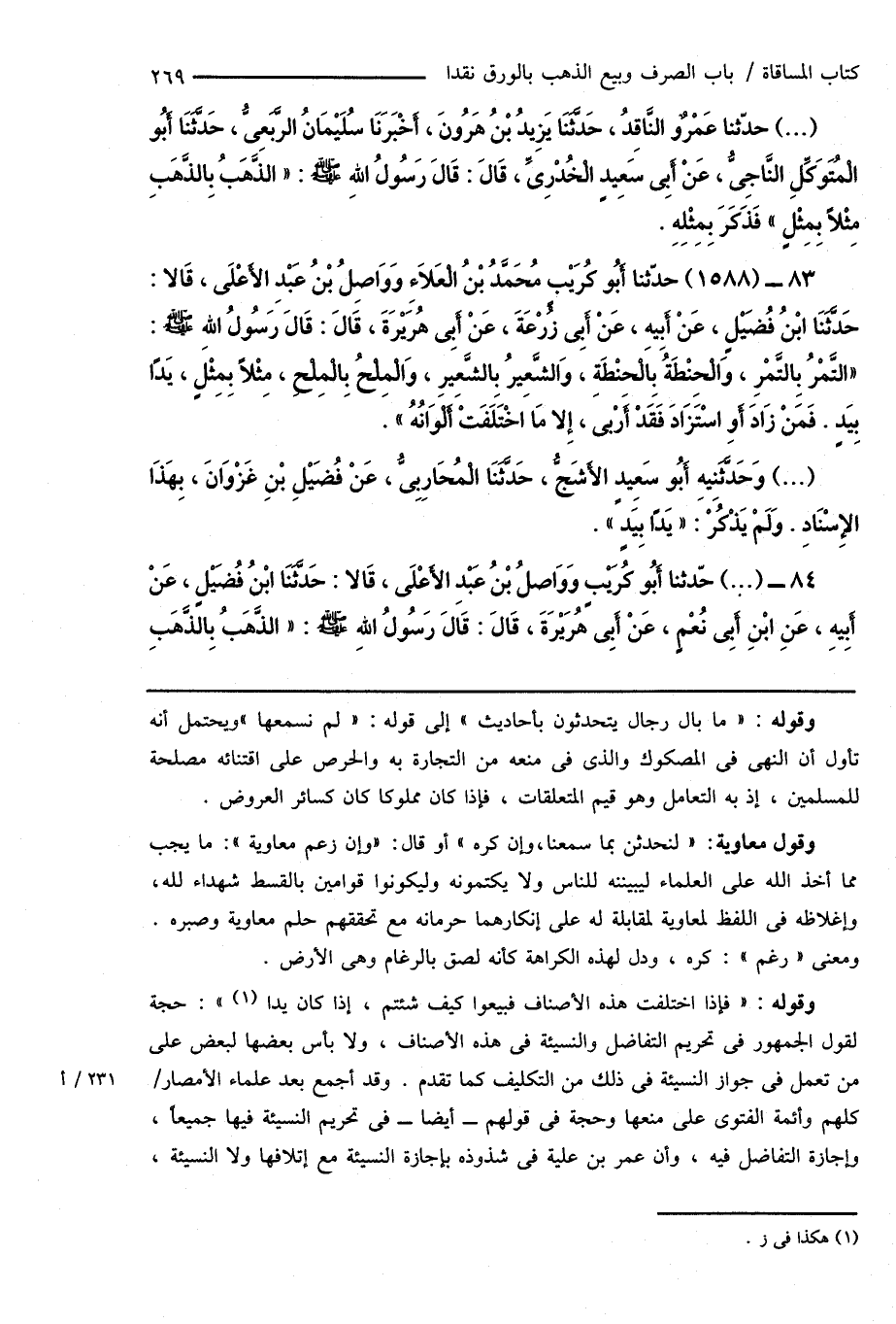 84 - (...) حدّثنا أَبُو كُرَيْبٍ وَوَاصِلُ بْنُ عَبْدِ الأَعْلَى، قَالا: حَدَّثَنَا ابْنُ فُضَيْلٍ، عَنْ أَبِيهِ، عَنِ ابْنِ أَبِى نُعْمٍ، عَنْ أَبِى هُرَيْرَةَ، قَالَ: قَالَ رَسُولُ اللهِ صَلَّى اللهُ عَلَيْهِ وَسَلَّمَ: " الذَّهَبُ بِالذَّهَبِ