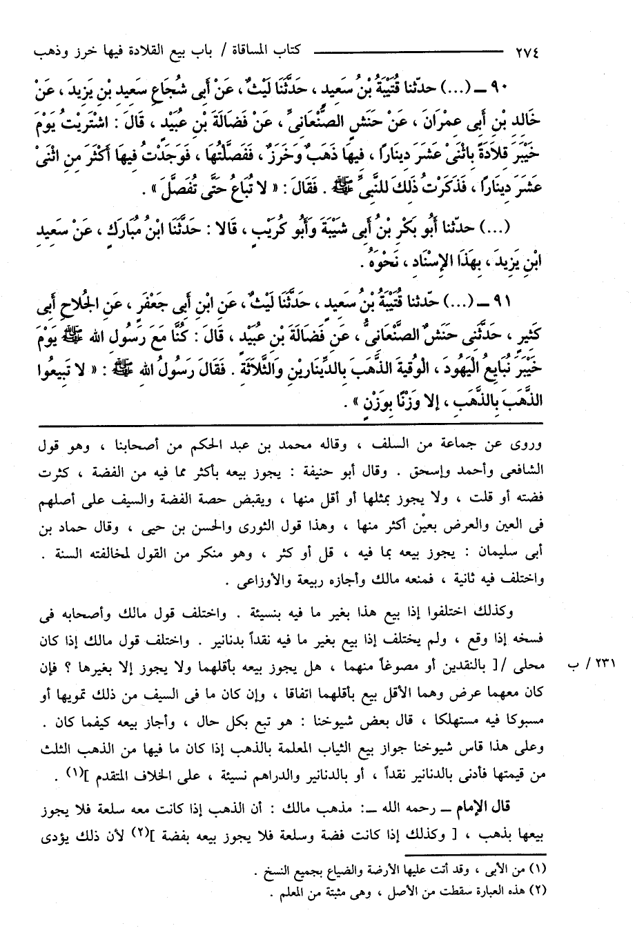 90 - (...) حدّثنا قُتَيْبَةُ بْنُ سَعِيدٍ، حَدَّثَنَا لَيْثٌ، عَنْ أَبِى شُجَاعِ سَعِيدِ بْنِ يَزِيدَ، عَنْ خَالِدِ بْنِ أَبِى عِمْرَانَ، عَنْ حَنَشٍ الصَّنْعَانِىِّ، عَنْ فَضَالَةَ بْنِ عُبَيْدٍ، قَالَ: اشْتَريْتُ يَوْمَ خَيْبَرَ قِلَادَةً بِاثْنَىْ عَشَرَ دِينَارًا، فِيهَا ذَهَبٌ وَخَرَزٌ، فَفَصَّلْتُهَا، فَوَجَدْتُ فِيهَا أَكْثَرَ مِنِ اثْنَىْ عَشَرَ دِينَارًا، فَذَكَرْتُ ذَلِكَ للنَبِىِّ صَلَّى اللهُ عَلَيْهِ وَسَلَّمَ. فَقَالَ: " لا تُبَاعُ حَتَّى تُفَصَّلَ ".