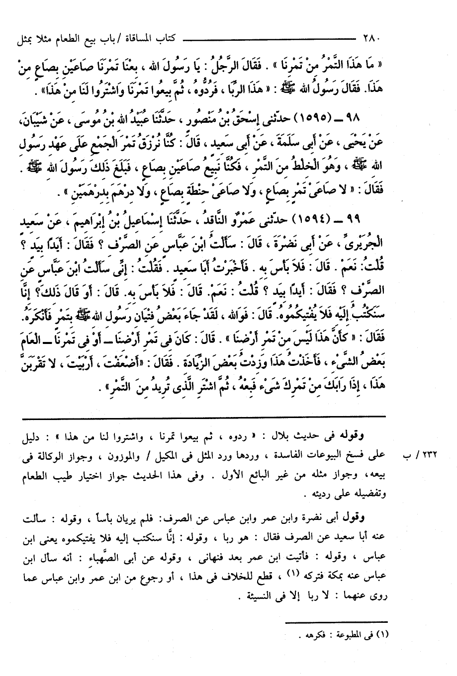 99 - (1594) حدّثنى عَمْرٌو النَّاقِدُ، حَدَّثَنَا إِسْمَاعِيلُ بْنُ إِبْرَاهِيمَ، عَنْ سَعِيدٍ الْجُرَيْرِىِّ، عَنْ أَبِى نَضْرَةَ، قَالَ: سَأَلْتُ ابْنَ عَبَّاسٍ عَنِ الصَّرْفِ؟ فَقَالَ: أَيَدًا بِيَدٍ؟ قُلْتُ: نَعَمْ. قَالَ: فَلَا بَأْسَ بِهِ. فَأَخْبَرْتُ أَبَا سَعِيدٍ. فَقُلْتُ: إِنِّى سَأَلْتُ ابْنَ عَبَّاسٍ عَنِ الصَّرْفِ؟ فَقَالَ: أَيدًا بِيَدٍ؟ قُلْتُ: نَعَمْ. قَالَ: فَلَا بَأْسَ بِهِ. قَالَ: أَوَ قَالَ ذَلِكَ؟ إِنَّا سَنَكْتُبُ إِلَيْهِ فَلَا يُفْتِيكُمُوهُ. قَالَ: فَوَاللهِ، لَقَدْ جَاءَ بَعْضُ فِتْيَانِ رَسُولِ اللهِ صَلَّى اللهُ عَلَيْهِ وَسَلَّمَ بِتَمْرٍ فَأَنْكَرَهُ. فَقَالَ: " كَأَنَّ هَذَا لَيْسَ منْ تَمْرِ أَرْضِنَا ". قَالَ: كَانَ فِى تَمْرِ أَرْضِنَا - أَوْ فِى تَمْرنَا - الْعَامَ بَعْضُ الشَّىْءِ، فَأَخَذْتُ هَذَا وَزِدْتُ بَعْضَ الزِّيَادَةِ. فَقَالَ: " أَضْعَفْتَ، أَرْبَيْتَ، لا تَقْرَبَنَّ هَذَا، إِذَا رَابَكَ مِنْ تَمْرِكَ شَىْء فَبِعْهُ، ثُمَّ اشْتَرِ الَّذِى تُرِيدُ مِنَ التَّمْرِ ".