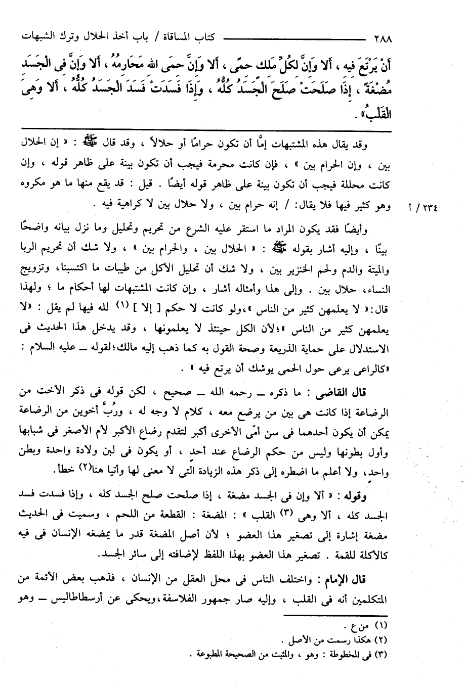 أَنْ يَرْتَعَ فِيهِ، أَلا وَإِنَّ لِكُلِّ مَلِكٍ حِمًى، أَلا وَإِنَّ حِمَى اللهِ مَحَارِمُهُ، أَلا وَإِنَّ فِى الْجَسَدِ مُضْغَةً، إِذَا صَلَحَتْ صَلَحَ الْجَسَدُ كُلُّهُ، وَإِذَا فَسَدَتْ فَسَدَ الْجَسَدُ كُلُّهُ، أَلا وَهِىَ الْقَلْبُ ".