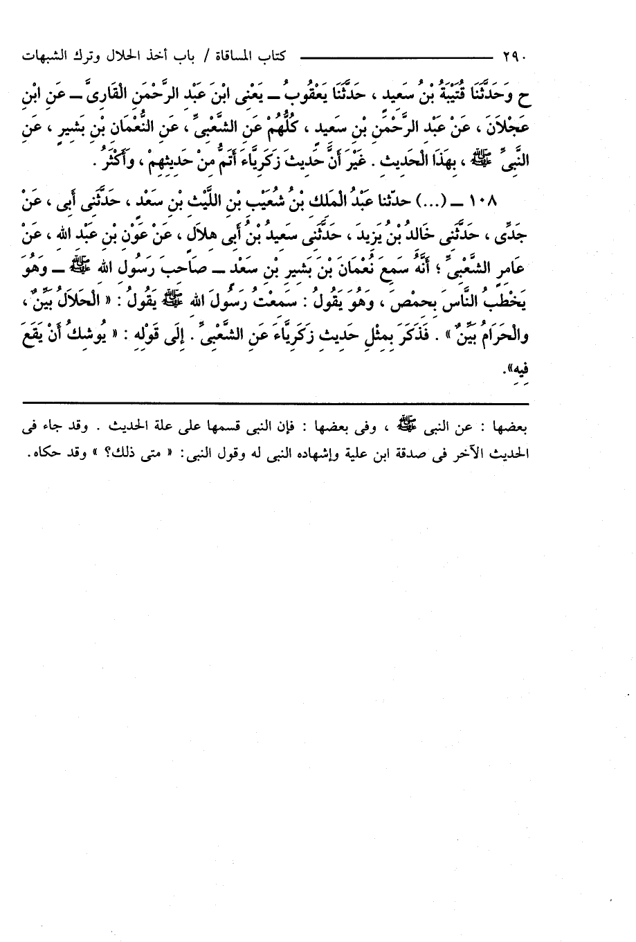 108 - (...) حدّثنا عَبْدُ الْمَلِكِ بْنُ شُعَيْبِ بْنِ اللَّيْثِ بْنِ سَعْدٍ، حَدَّثَنِى أَبِى، عَنْ جَدِّى، حَدَّثَنِى خَالِدُ بْنُ يَزِيدَ، حَدَّثَنِى سَعِيدُ بْنُ أَبِى هِلَالٍ، عَنْ عَوْنِ بْنِ عَبْدِ اللهِ، عَنْ عَامِرٍ الشَّعْبِىِّ؛ أَنَّهُ سَمِعَ نُعْمَانَ بْنَ بَشِيرِ بْنِ سَعْدٍ - صَاحِبَ رَسُولِ اللهِ صَلَّى اللهُ عَلَيْهِ وَسَلَّمَ - وَهُوَ يَخْطبُ النَّاسَ بِحِمْصَ، وَهُوَ يَقُولُ: سَمِعْتُ رَسُولَ اللهِ صَلَّى اللهُ عَلَيْهِ وَسَلَّمَ يَقُولُ: " الْحَلَالُ بَيِّنٌ، والْحَرَامُ بَيِّنٌ ". فَذَكَرَ بِمِثْلِ حَدِيثِ زَكَرِيَّاءَ عَنِ الشَّعْبِىِّ. إِلَى قَوْلِهِ: " يُوشِكُ أَنْ يَقَعَ فِيهِ ".