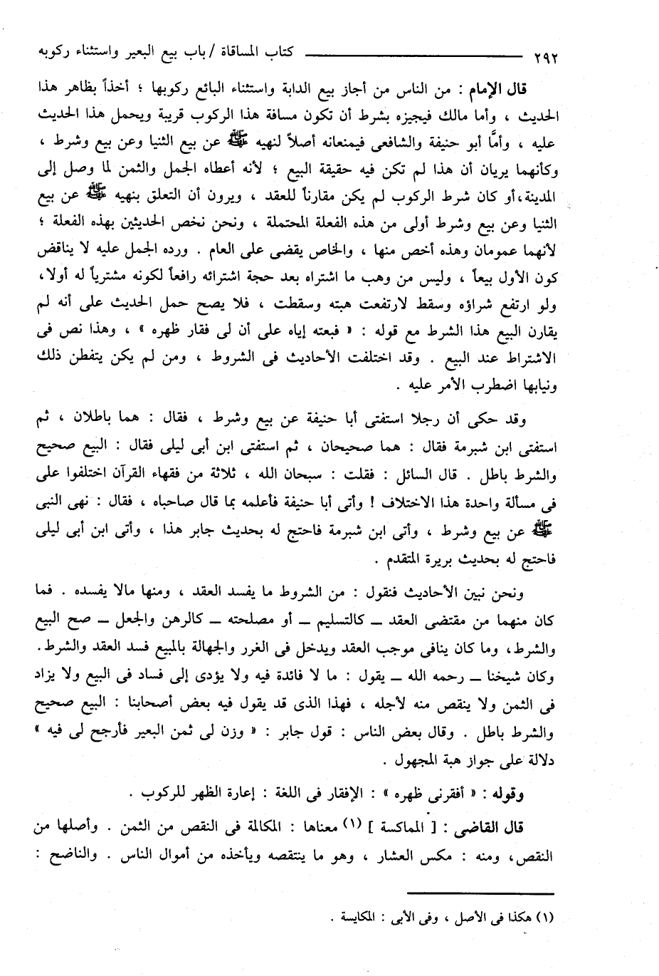 قال الإمام: من الناس من أجاز بيع الدابة واستثناء البائع ركوبها؛ أخذاً بظاهر هذا الحديث، وأما مالك فيجيزه بشرط أن تكون مسافة هذا الركوب قريبة ويحمل هذا الحديث عليه، وأمَّا أبو حنيفة والشافعى فيمنعانه أصلاً لنهيه صَلَّى اللهُ عَلَيْهِ وَسَلَّمَ عن بيع الثنيا وعن بيع وشرط، وكأنهما يريان أن هذا لم تكن فيه حقيقة البيع، لأنه أعطاه الجمل والثمن لما وصل إلى المدينة، أو كان شرط الركوب لم يكن مقارناً للعقد، ويرون أن التعلق بنهيه صَلَّى اللهُ عَلَيْهِ وَسَلَّمَ عن بيع الثنيا وعن بيع وشرط أولى من هذه الفعلة المحتملة، ونحن نخص الحديثين بهذه الفعلة؛ لأنهما عمومان وهذه أخص منها، والخاص يقضى على العام. ورده الجمل عليه لا يناقض كون الاول بيعاً، وليس من وهب ما اشتراه بعد حجة اشترائه رافعاً لكونه مشترياً له أولاً، ولو ارتفع شراؤه وسقط لارتفعت هبته وسقطت، فلا يصح حمل الحديث على أنه لم يقارن البيع هذا الشرط مع قوله: " فبعته إياه على أن لى فقار ظهره "، وهذا نص فى الاشتراط عند البيع. وقد اختلفت الأحاديث فى الشروط، ومن لم يكن يتفطن ذلك ونيابها اضطرب الأمر عليه.