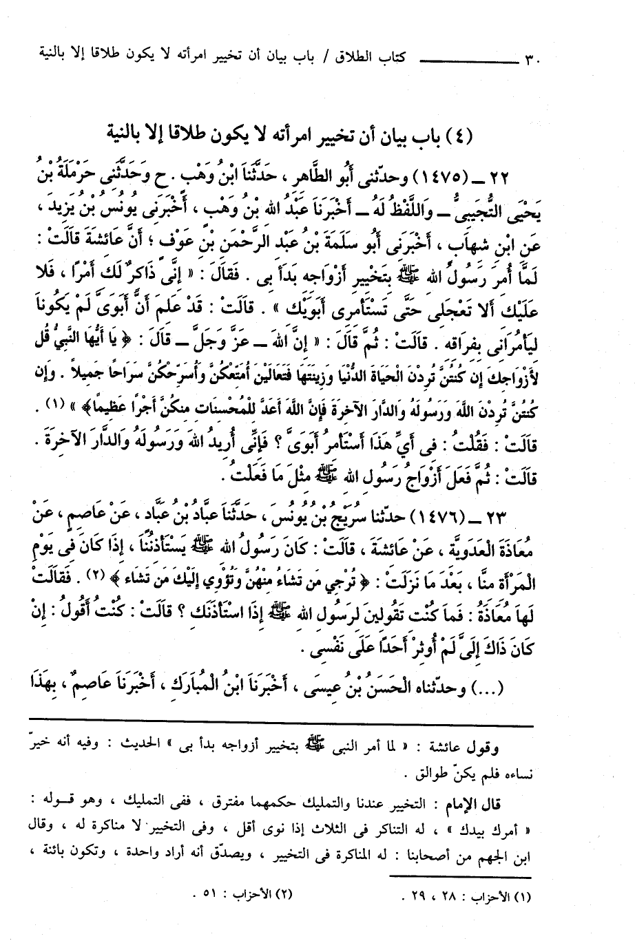 22 - (1475) وحدّثنى أَبُو الطَّاهِرِ، حَدَّثَنَا ابْنُ وَهْبٍ. ح وَحَدَّثَنِى حَرْمَلَةُ بْنُ يَحْيَى التُّجَيبِىُّ - وَاللَّفْظُ لَهُ - أَخْبَرَنَا عَبْدُ اللهِ بْنُ وَهْبٍ، أَخْبَرَنِى يُونُسُ بْنُ يَزِيدَ، عَنِ ابْنِ شِهَابٍ، أَخْبَرَنِى أَبُو سَلَمَةَ بْنُ عَبْدِ الرَّحْمَنِ بْنِ عَوْفٍ؛ أَنَّ عَائِشَةَ قَالَتْ: لَمَّا أُمِرَ رَسُولُ اللهِ صَلَّى اللهُ عَلَيْهِ وَسَلَّمَ بِتَخْيِيرِ أَزْوَاجِهِ بَدَأَ بِى. فَقَالَ: " إِنَّى ذَاكِرٌ لَكَ أَمْرًا، فَلا عَلَيْكِ أَلا تَعْجَلِى حَتَّى تَسْتَأمِرِى أَبَوَيْكِ ". قَالَتْ: قَدْ عَلِمَ أَنَّ أَبَوَىَّ لَمْ يَكُونَا لِيَأمُرَانِى بِفِرَاقِهِ. قَالَتْ: ثُمَّ قَالَ: " إِنَّ اللهَ - عَزَّ وَجَلَّ - قَالَ: {يَا أَيُّهَا النَّبِيُّ قُل لأَزْوَاجِكَ إِن كُنَتُنَّ تُرِدْنَ الْحَيَاةَ الدُّنْيَا وَزِينَتَهَا فَتَعَالَيْنَ أُمَتِّعْكُنَّ وَأُسَرِّحْكُنَّ سَرَاحًا جَمِيلاً. وَإِن كُنْتُنَّ تُرِدْنَ اللَّهَ وَرَسُولَهُ وَالدَّارَ الآخِرَةَ فَإِنَّ اللهَ أَعَدَّ لِلْمُحْسِنَاتِ مِنكُنَّ أَجْرًا عَظِيمًا " (¬1). قَالَتْ: فَقُلْتُ: فِى أَىِّ هَذَا أَسْتَأمِرُ أَبَوَىَّ؟ فَإِنِّى أُرِيدُ اللهَ وَرَسُولَهُ وَالدَّارَ الآخِرَةَ. قَالَتْ: ثُمَّ فَعَلَ أَزْوَاجُ رَسُولِ اللهِ صَلَّى اللهُ عَلَيْهِ وَسَلَّمَ مِثْلَ مَا فَعَلْتُ.
