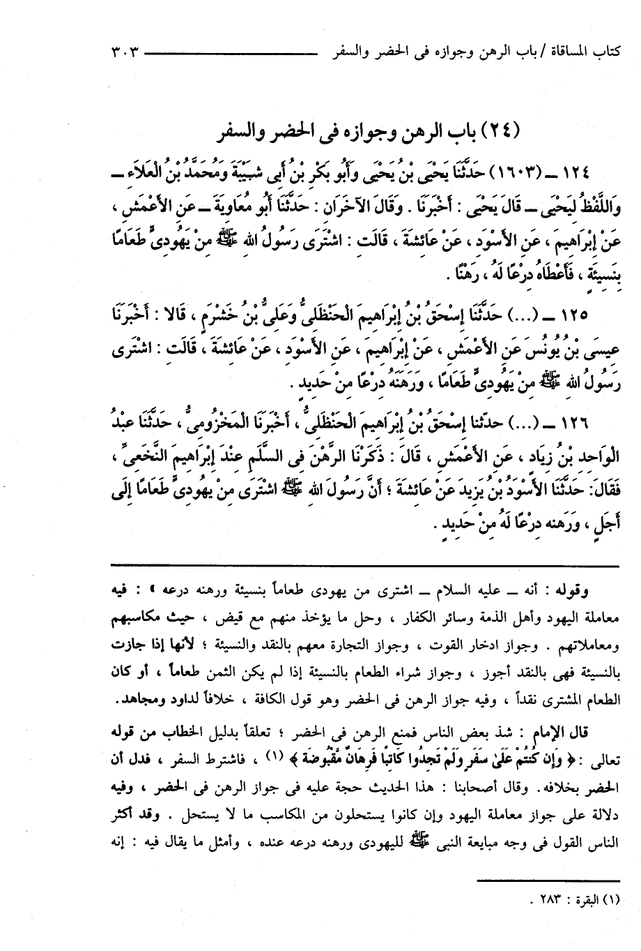 125 - (...) حَدَّثَنَا إِسْحَاقُ بْنُ إِبْرَاهِيمَ الْحَنْظَلِىُّ وَعَلِىُّ بْنُ خَشْرَمٍ، قَالا: أَخْبَرَنَا عِيسَى بْنُ يُونُسَ عَنِ الأَعْمَشِ، عَنْ إِبْرَاهِيمَ، عَنِ الأَسْوَدِ، عَنْ عَائِشَةَ، قَالَتِ: اشْتَرى رَسُولُ اللهِ صَلَّى اللهُ عَلَيْهِ وَسَلَّمَ مِنْ يَهُودِىٍّ طَعَامًا، وَرَهَنَهُ دِرْعًا مِنْ حَدِيدٍ.
