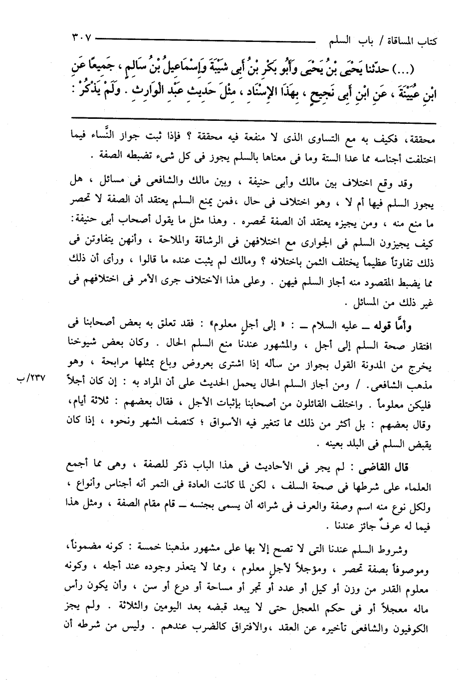 وشروط السلم عندنا التى لا تصح إلا بها على مشهور مذهبنا خمسة: كونه مضموناً، وموصوفاً بصفة تحصر، ومؤجلاً لأجلٍ معلوم، ومما لا يتعذر وجوده عند أجله، وكونه معلوم القدر من وزن أو كيل أو عدد أو تجر أو مساحة أو درع أو سن، وأن يكون رأس ماله معجلاً أو فى حكم المعجل حتى لا يبعد قبضه بعد اليومين والثلاثة. ولم يجز الكوفيون والشافعى تأخيره عن العقد، والافتراق كالضرب عندهم. وليس من شرطه أن