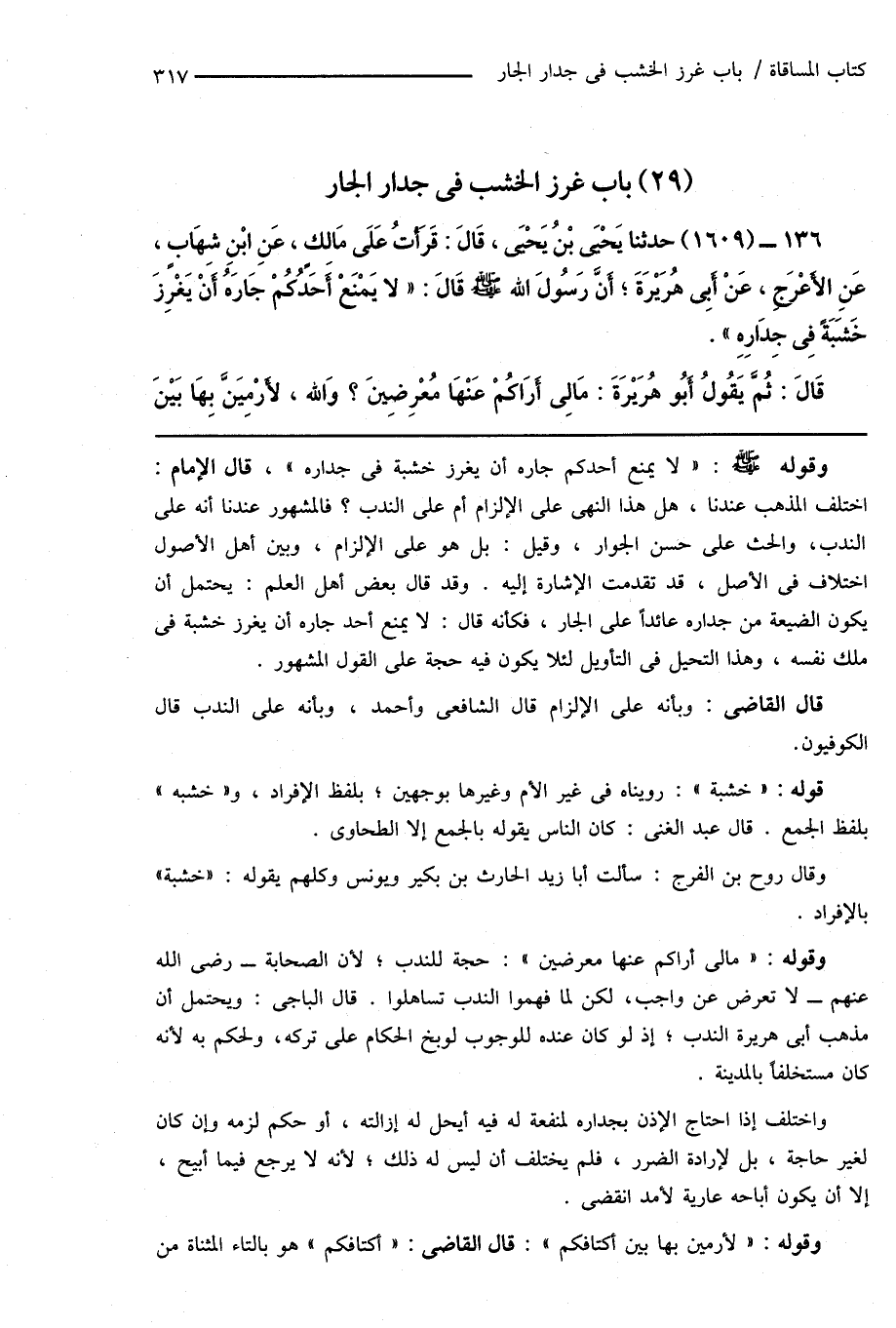 136 - (1609) حدثنا يَحْيَى بْنُ يَحْيَى، قَالَ: قَرَأْتُ عَلَى مَالِكٍ، عَنِ ابْنِ شِهَابٍ، عَنِ الأَعْرَجِ، عَنْ أَبِى هُرَيْرَةَ؛ أَنَّ رَسُولَ اللهِ صَلَّى اللهُ عَلَيْهِ وَسَلَّمَ قَالَ: " لا يَمْنَعْ أَحَدُكُمْ جَارَهُ أن يَغْرِزَ خَشَبَةً فِى جِدَارِهِ ".