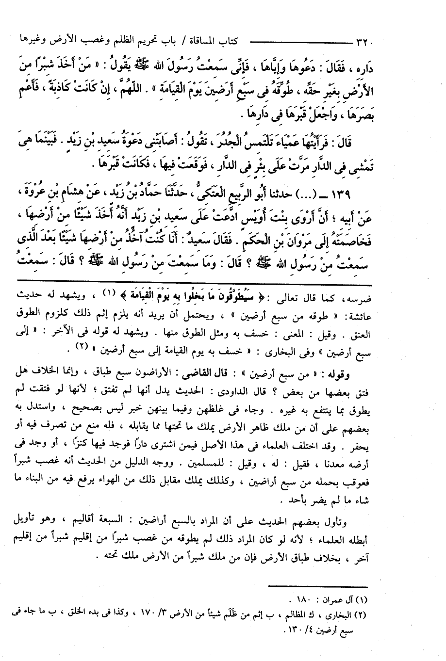 (¬2) البخارى، ك المظالم، ب إثم من ظَلَم شيئًا من الأرض 3/ 170، وكذا فى بدء الخلق، ب ما جاء فى سبع أرضين 4/ 130.