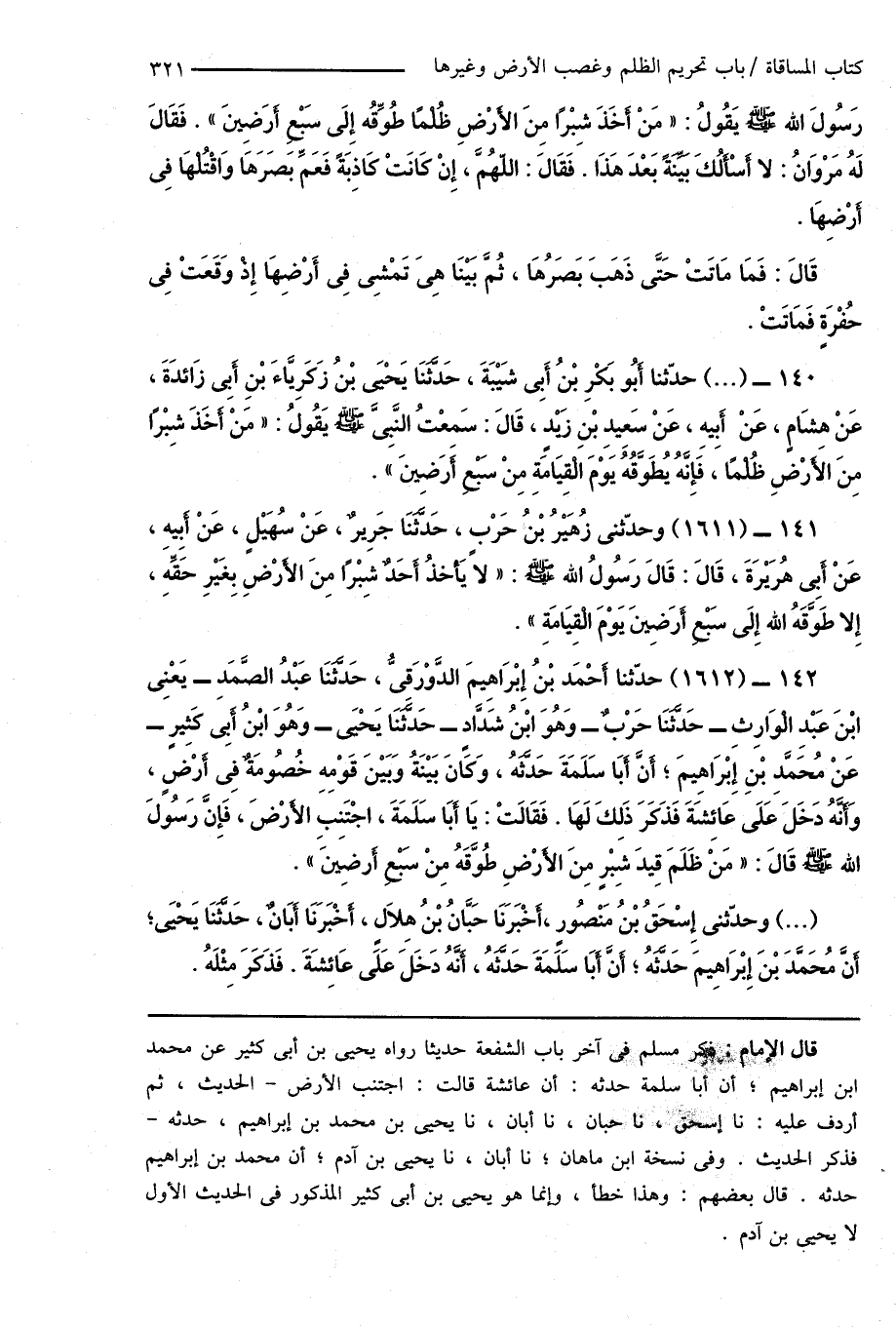 142 - (1612) حدّثنا أَحْمَدُ بْنُ إِبْرَاهِيمَ الدَّوْرَقِىُّ، حَدَّثَنَا عَبْدُ الصَّمَدِ - يَعْنِى ابْنَ عَبْدِ الْوَارِثِ - حَدَّثَنَا حَرْبٌ - وَهُوَ ابْنُ شَدَّادٍ - حَدَّثَنَا يَحْيَى - وَهُوَ ابْنُ أَبِى كَثِيرٍ - عَنْ مُحَمَّدِ بْنِ إِبْرَاهِيمَ؛ أَنَّ أَبَا سَلَمَةَ حَدَّثَهُ، وَكَانَ بَيْنَهُ وَبَيْنَ قَوْمِهِ خُصُومَةٌ فِى أَرْضٍ، وَأَنَّهُ دَخَلَ عَلَى عَائِشَةَ فَذَكَرَ ذَلِكَ لَهَا. فَقَالَتْ: يَا أَبَا سَلَمَةَ، اجْتَنِبِ الأَرْضَ، فَإِنَّ رَسُولَ اللهِ صَلَّى اللهُ عَلَيْهِ وَسَلَّمَ قَالَ: " مَنْ ظَلَمَ قِيدَ شِبْرٍ مِنَ الأَرْضِ طُوَّقَهُ مِنْ سَبْعِ أَرضِينَ ".