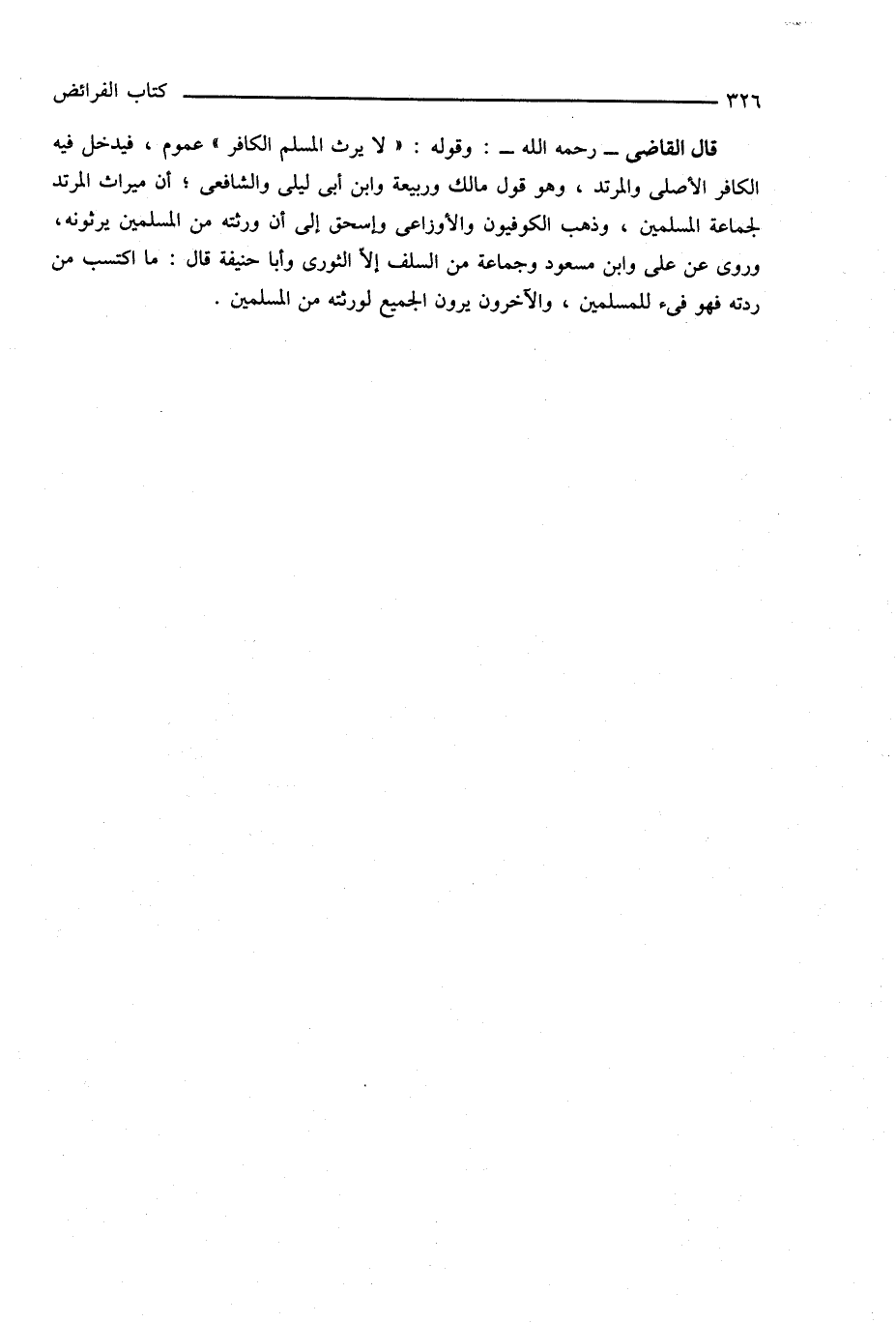 قال القاضى - رحمه الله -: وقوله: " لا يرث المسلم الكافر " عموم، فيدخل فيه الكافر الأصلى والمرتد، وهو قول مالك وربيعة وابن أبى ليلى والشافعى؛ أن ميراث المرتد لجماعة المسلمين، وذهب الكوفيون والأوزاعى وإسحاق إلى أن ورثته من المسلمين يرثونه، وروى عن على وابن مسعود وجماعة من السلف إلّا الثورى وأبا حنيفة قال: ما اكتسب من ردته فهو فىء للمسلمين، والآخرون يرون الجميع لورثته من المسلمين.