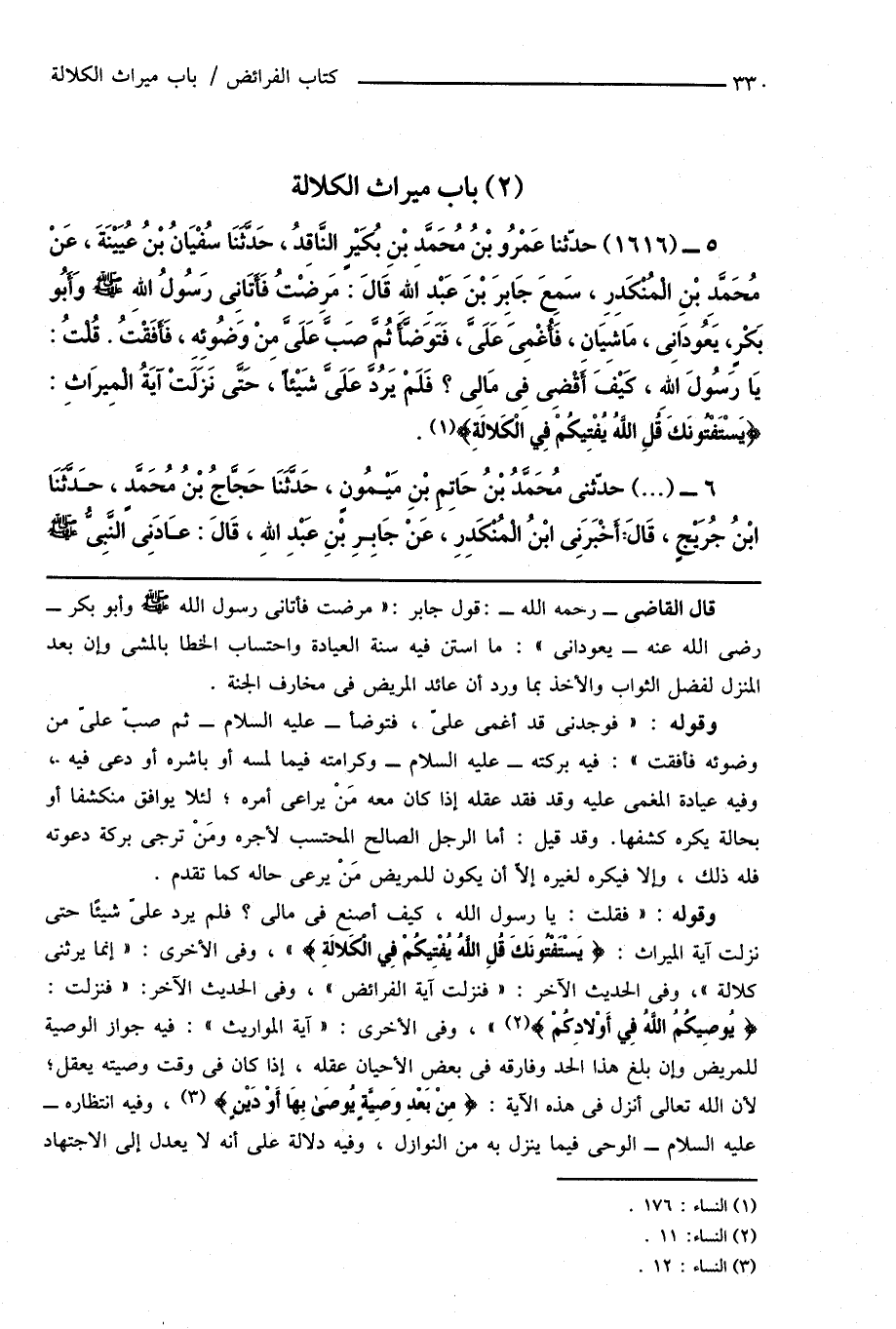 5 - (1616) حدّثنا عَمْرُو بْنُ مُحَمَّدِ بْنِ بُكَيْرٍ النَّاقِدُ، حَدَّثَنَا سُفْيَانُ بْنُ عُيَيْنَةَ، عَنْ مُحَمَّدِ بْنِ الْمُنْكَدِرِ، سَمِعَ جَابِرَ بْنَ عَبْدِ اللهِ قَالَ: مَرِضْتُ فَأَتَانِى رَسُولُ اللهِ صَلَّى اللهُ عَلَيْهِ وَسَلَّمَ وَأَبُو بَكْرٍ، يَعُودَانِى، مَاشِيَانِ، فَأُغْمِىَ عَلَىَّ، فَتَوَضَّأَ ثُمَّ صَبَّ عَلَىَّ مِنْ وَضُوئِهِ، فَأَفَقْتُ. قُلْتُ: يَا رَسُولَ اللهِ، كَيْفَ أَقْضِى فِى مَالِى؟ فَلَمْ يَرُدَّ عَلَىَّ شَيْئاً، حَتَّى نَزَلَتْ آيَةُ الْمِيرَاثِ: {يَسْتَفْتُونَكَ قُلِ اللَّهُ يُفْتِيكُمْ فِي الْكَلالَةِ} (¬1).