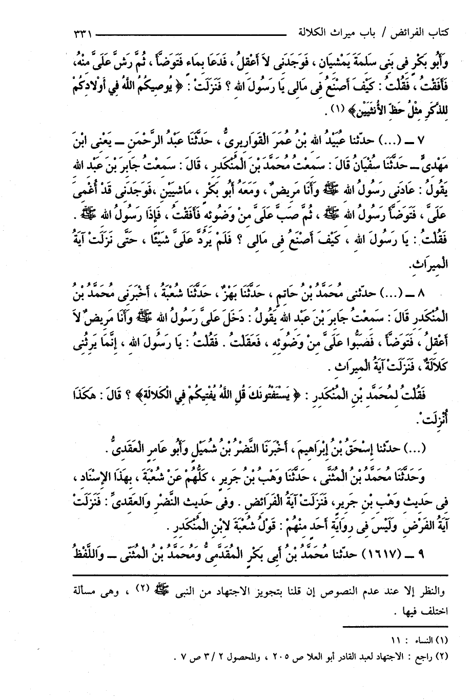 7 - (...) حدّثنا عُبَيْدُ اللهِ بْنُ عُمَرَ الْقَوَارِيرِىُّ، حَدَّثَنَا عَبْدُ الرَّحْمَنِ - يَعْنِى ابْنَ مَهْدِىٍّ - حَدَّثَنَا سُفْيَانُ قَالَ: سَمِعْتُ مُحَمَّدَ بْنَ الْمُنْكَدِرِ، قَالَ: سَمِعْتُ جَابِرَ بْنَ عَبْدِ اللهِ يَقُولُ: عَادَنِى رَسُولُ اللهِ صَلَّى اللهُ عَلَيْهِ وَسَلَّمَ وَأَنَا مَرِيضٌ، وَمَعَهُ أَبُو بَكْرٍ، مَاشِيَيْنِ، فَوَجَدَنِى قَدْ أُغْمِىَ عَلَىَّ، فَتَوَضَّأَ رَسُولُ اللهِ صَلَّى اللهُ عَلَيْهِ وَسَلَّمَ، ثُمَّ صَبَّ عَلَىَّ مِنْ وَضُوئِهِ فَأَفَقْتُ، فَإِذَا رَسُولُ اللهِ صَلَّى اللهُ عَلَيْهِ وَسَلَّمَ. فَقُلْتُ: يَا رَسُولَ اللهِ، كَيْفَ أَصْنَعُ فِى مَالِى؟ فَلَمْ يَرُدَّ عَلَىَّ شَيْئًا، حَتَّى نَزَلَتْ آيَةُ الْمِيرَاثِ.